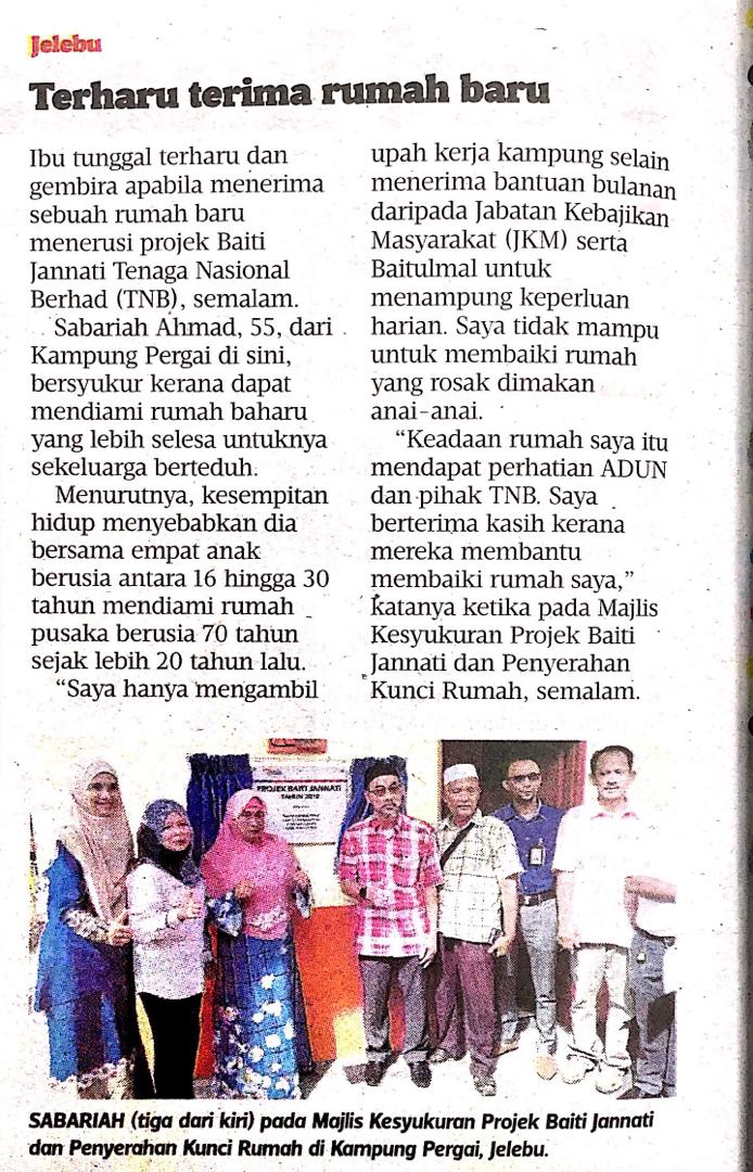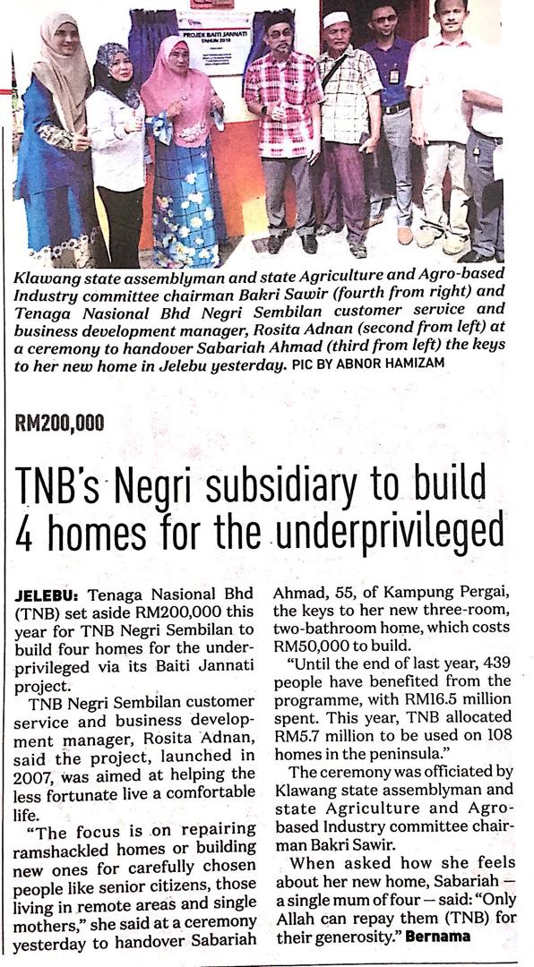 Tajuk :TNB's Negri subsidiary to build 4 homes for the underprivileged