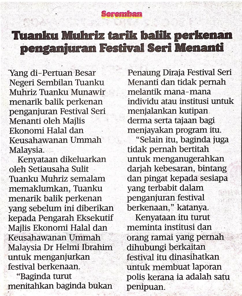 Tajuk :Tuanku Muhriz tarik balik perkenan penganjuran Festival Seri Menanti