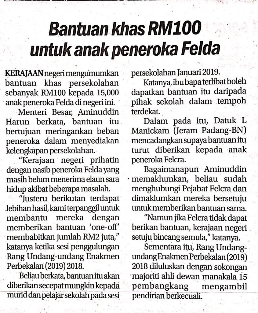 Tajuk :Bantuan khas RM100 untuk anak peneroka Felda