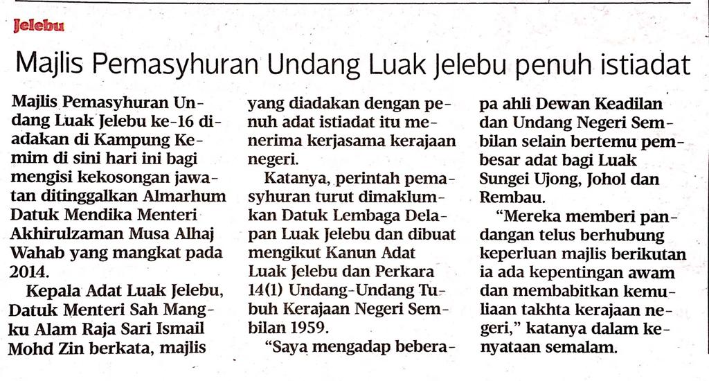 Tajuk :Majlis pemasyhuran undang luak jelebu penuh istiadat