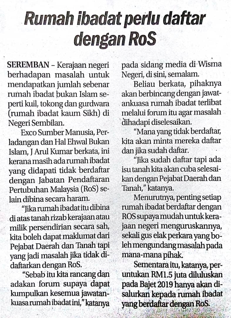 Tajuk :Rumah ibadat perlu daftar dengan RoS