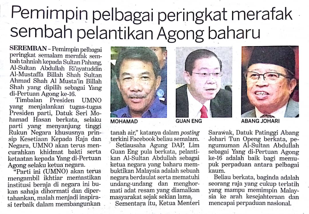 Tajuk :Pemimpin pelbagai peringkat merafak sembah pelantikan Agong baharu