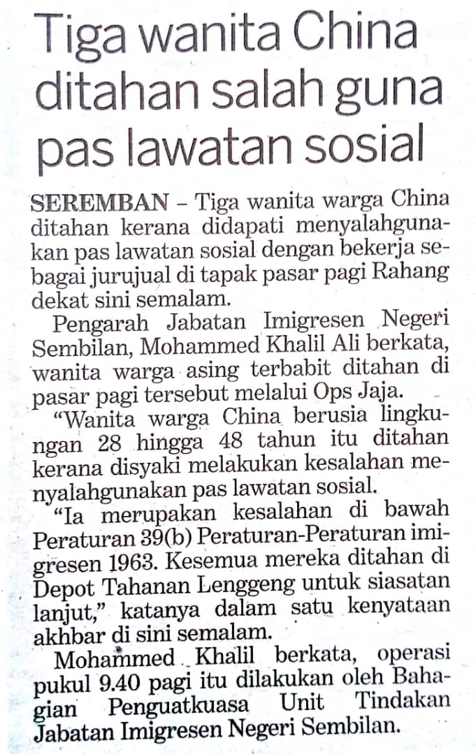 Tajuk :Tiga wanita China ditahan salah guna pas lawatan sosial
