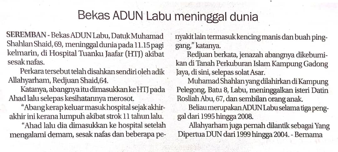 Tajuk :Bekas ADUN Labu meninggal dunia