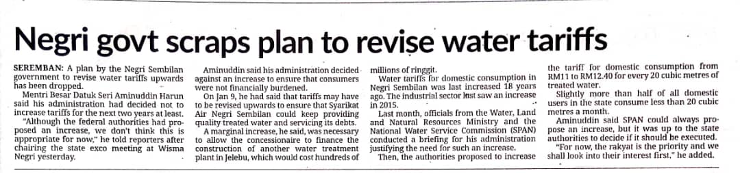 Tajuk :Negri govt scraps plan to revise water tariffs