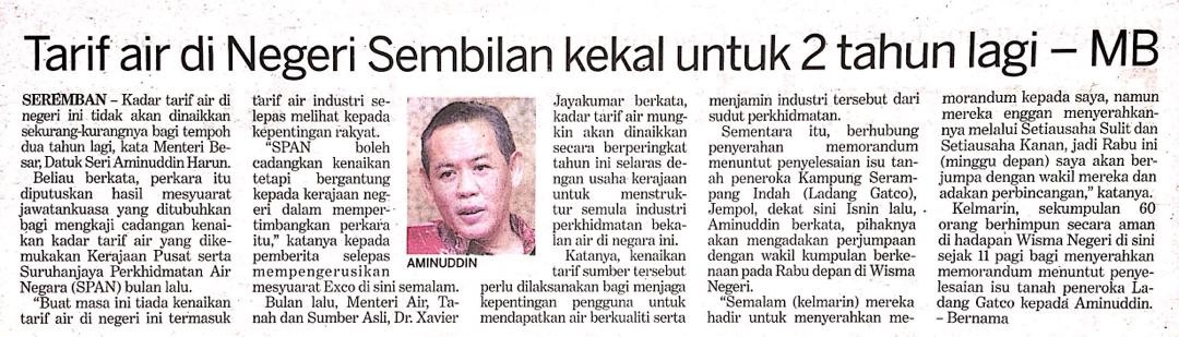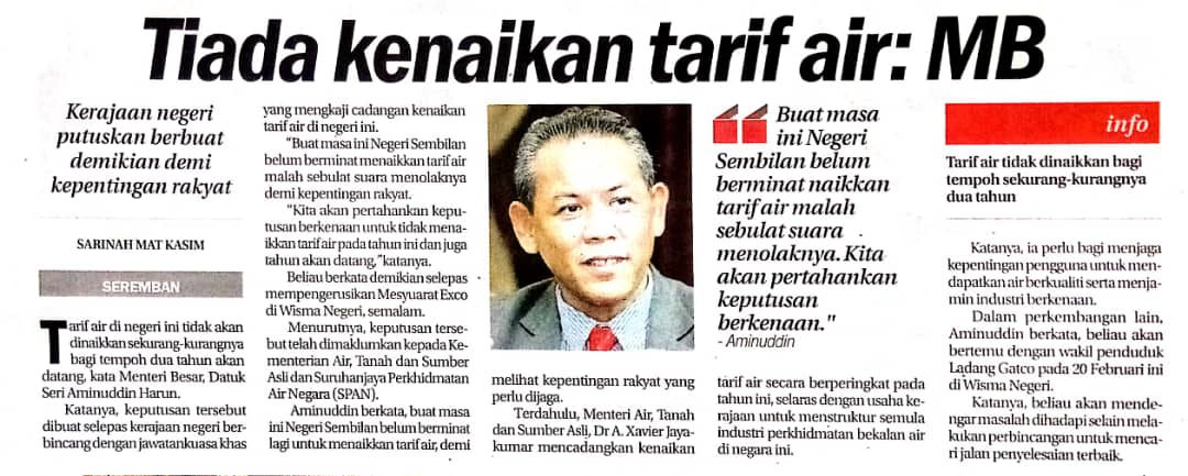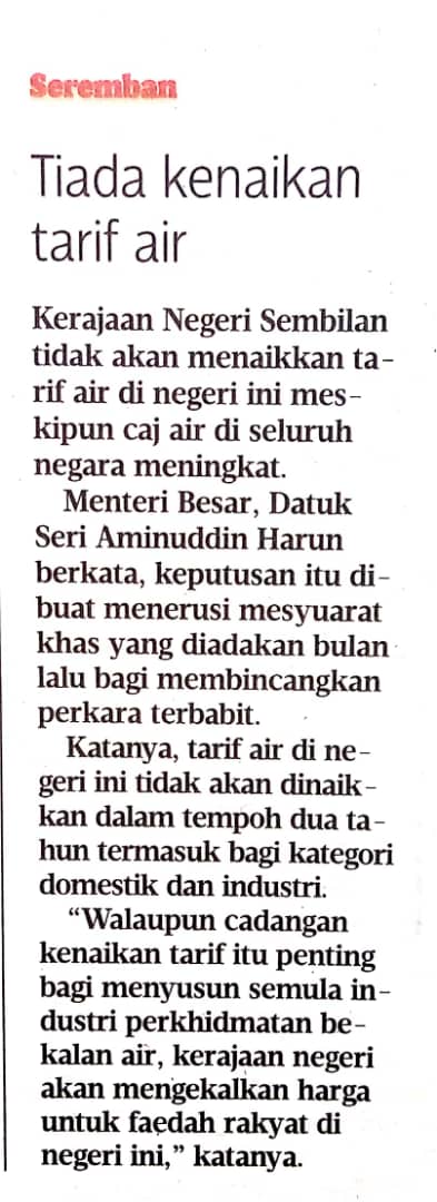 Tajuk :Tarif air di Negeri Sembilan kekal untuk 2 tahun lagi -MB