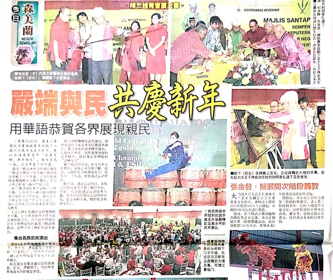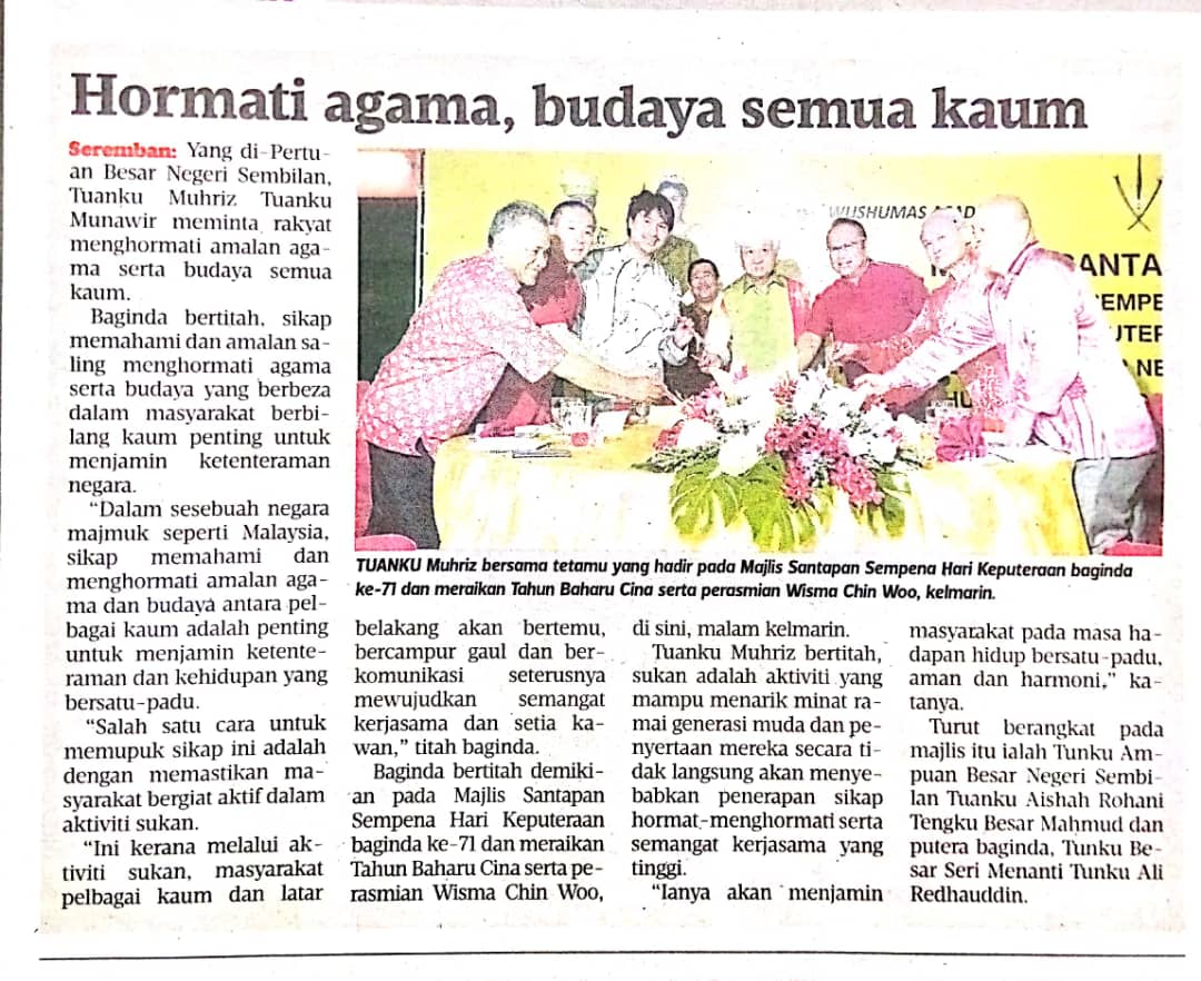 26 Februari 2019 26 Februari 2019 Tajuk :Hormati agama, budaya semua kaum Tarikh Berita:26 Februari 2019 Akhbar :Sinar Harian Tajuk :Yang Di-Pertuan Besar Negeri Sembilan, Tuanku Muhriz Tuanku Munawir mencemar duli meraikan Majlis Santapan Sempena Hari Keputeraan baginda ke-71 dan meraikan Tahun Baharu Cina serta Perasmian Wisma Chin Woo,Seremban kelmarin. Tarikh Berita:26 Februari 2019 Akhbar :China Press