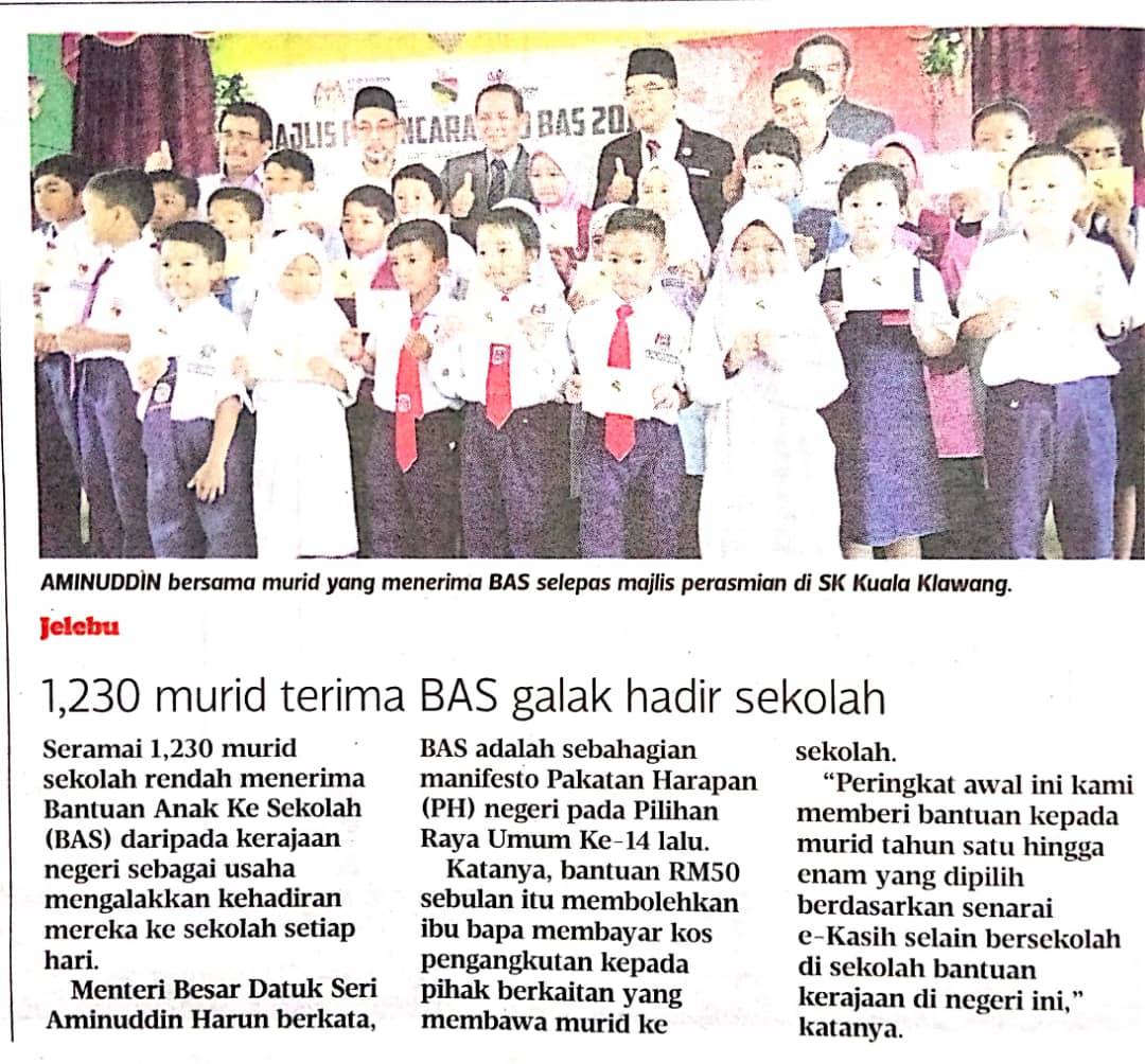 Tajuk :1,230 murid terima BAS galak hadir sekolah