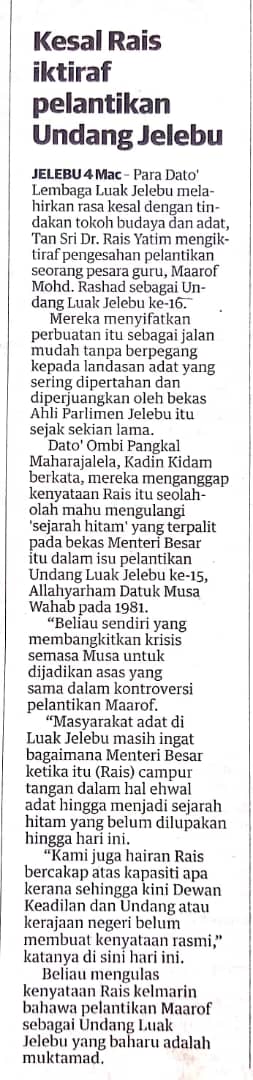 Tajuk :Kesal RAis iktiraf pelantikan Undag Jelebu