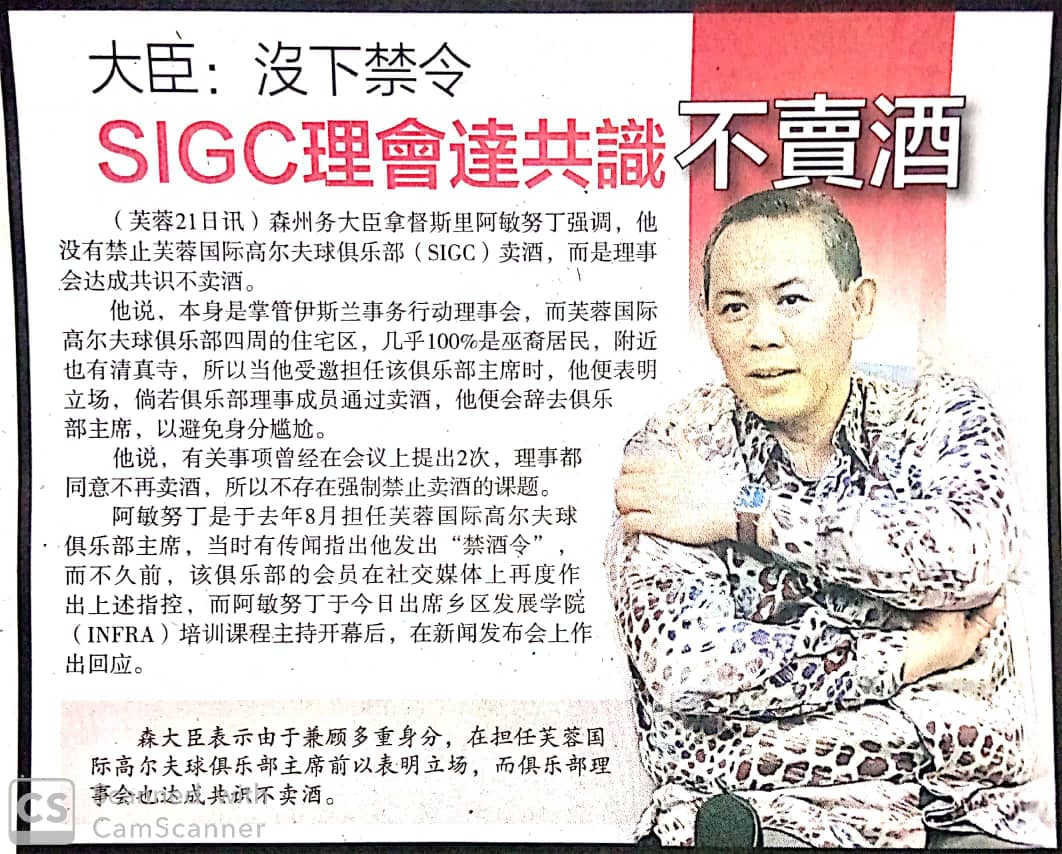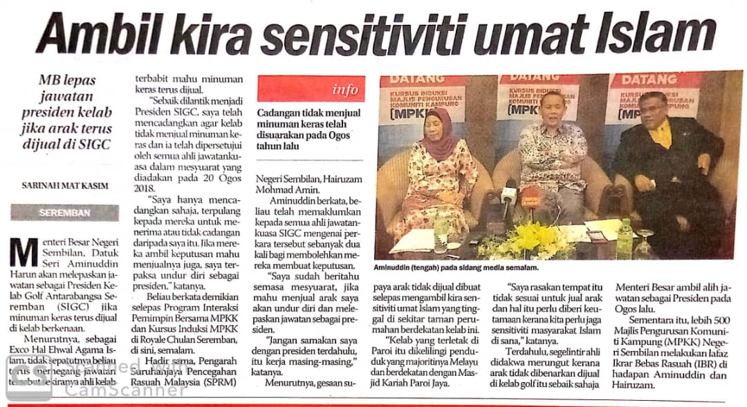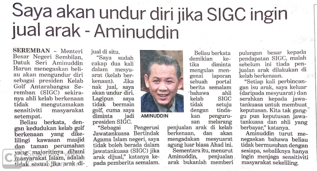 Tajuk :Ahli Kelab Golf Antarabangsa Seremban (SIGC) bersetuju agar kelab tidak menjual minuman keras dalam kelab berkenaan. Menurut presiden kelab tersebut beliau akan menarik diri jika hal ini masih berlarutan