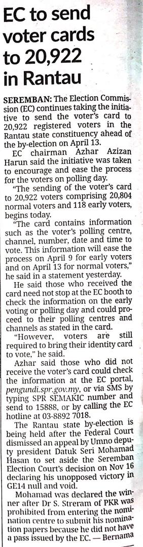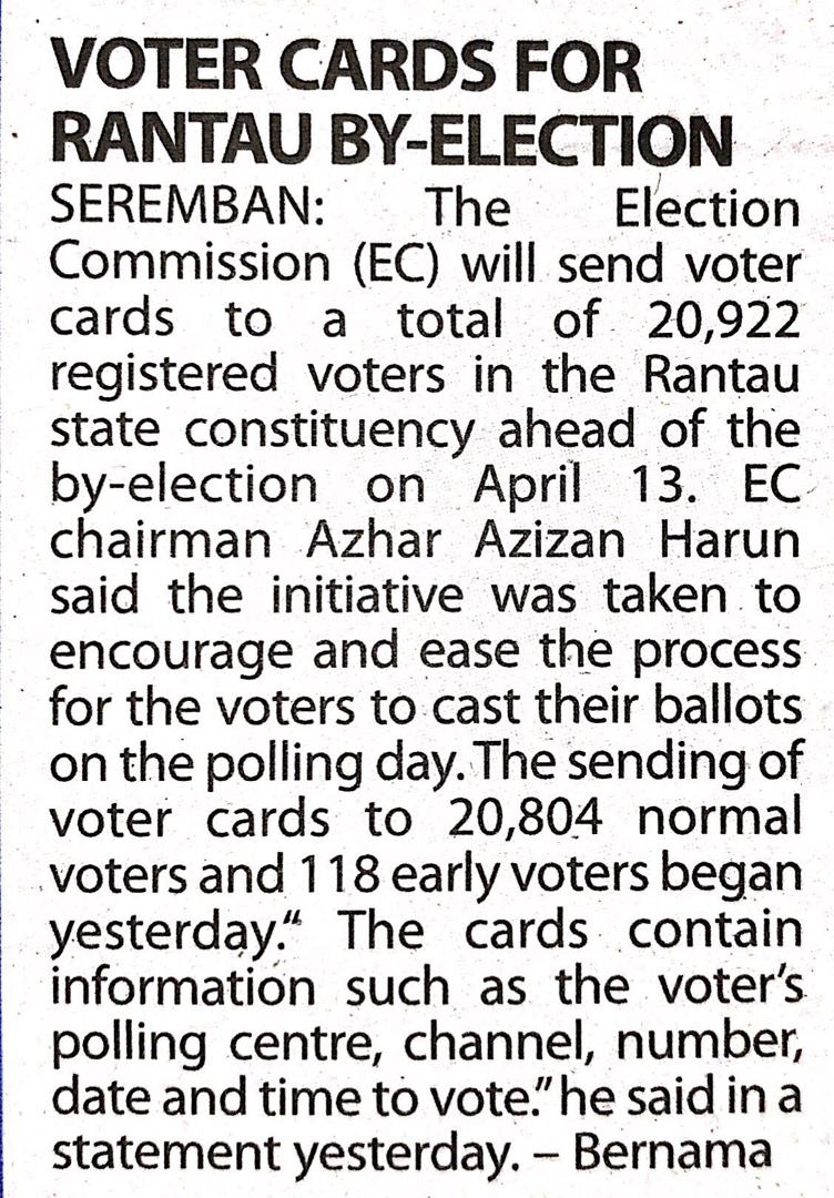 Tajuk :EC to send voter cards to 20922 in Rantau