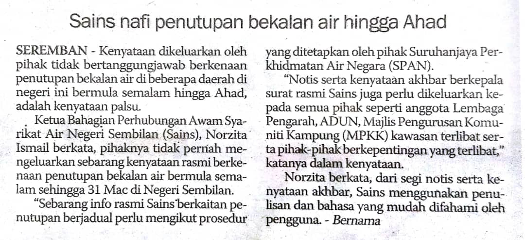 Tajuk :SAINS nafi penutupan bekalan air hingga Ahad