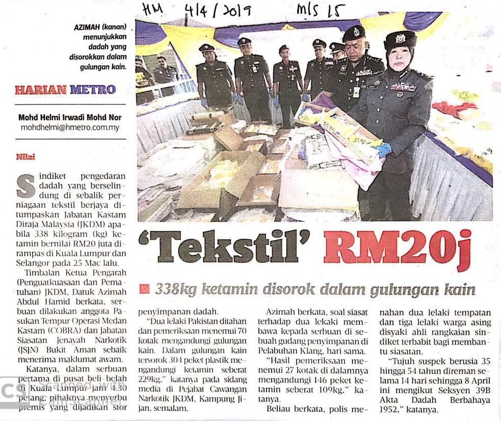 Tajuk :Tekstil RM20j-338kg ketamin disorok dalam gulungan kain