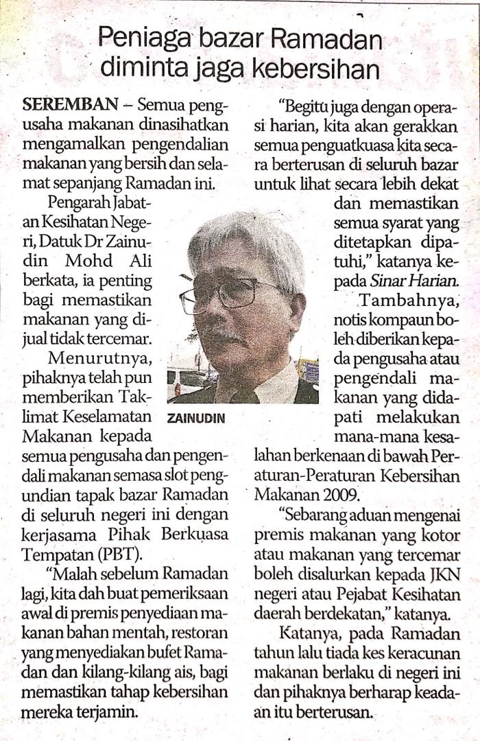 11 Mei 2019 Tajuk :Peniaga bazar Ramadan diminta jaga kebersihan Tarikh Berita:11 Mei 2019Akhbar :Sinar Harian