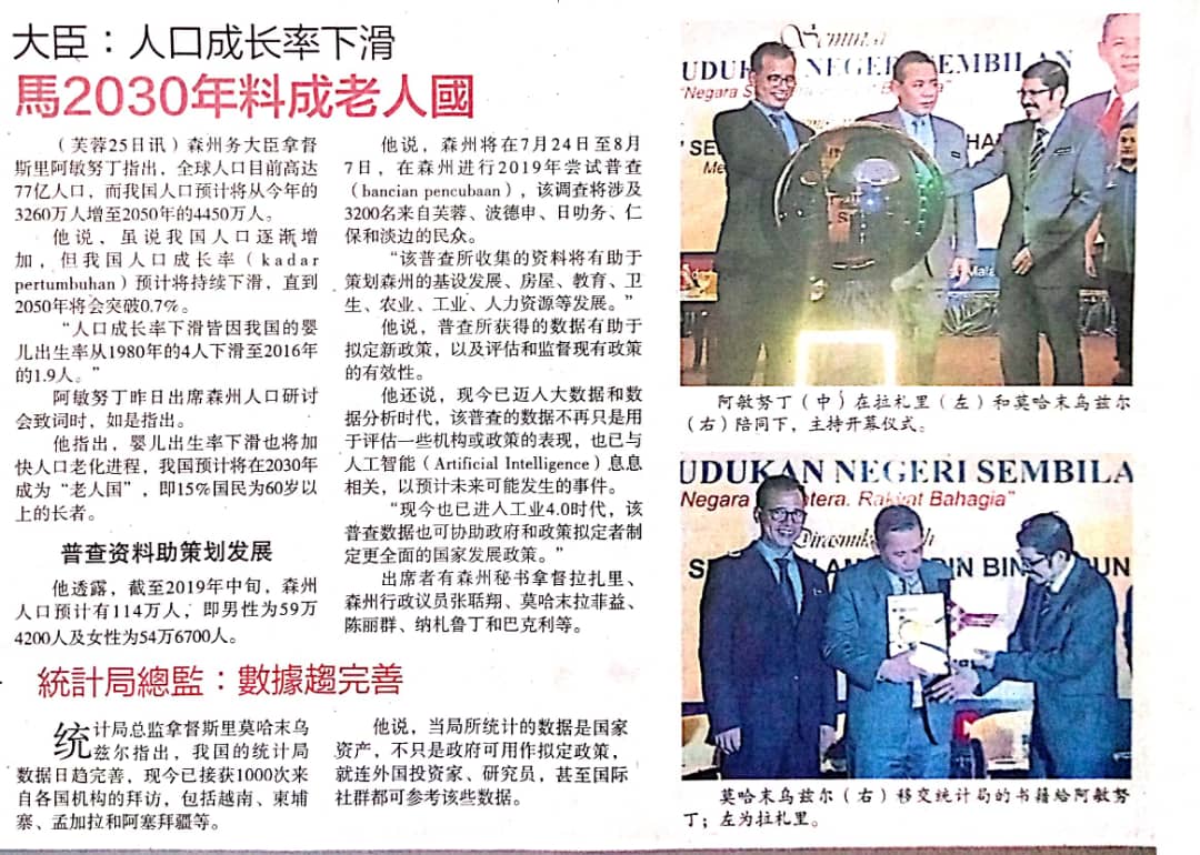 Tajuk :Seremban-MBNS merasmikan Seminar Kependudukan Negeri Sembilan yang bertemakan "Negara Sejahtera,Rakyat Bahagia" bertempat di Klana Resort, Seremban kelmarin. Seminar ini diadakan bersempena dengan Hari Banci Percubaan yang akan dilaksanakan sehingga 7 Ogos 2019. Beliau menyeru kepada masyarakat agar memberikan kerjasama kepada Jabatan Perangkaan Malaysia semass proses bancian tersebut dijalankan. Dengan maklumat yang tepat akan memudahkan kerajaan negeri membuat perancangan dan agihan sumber yang memanfaatkan rakyat.
