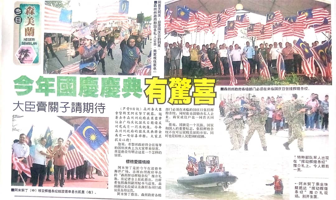 10 Ogos 2019 Tajuk :Port Dickson- MBNS merasmikan Majlis Pelancaran Kibar Jalur Gemilang Peringkat Negeri Sembilan 2019 bertempat di PD Waterfront, Port Dickson dengan bertemakan "Sayangi Malaysiaku, Malaysia Bersih" semalam. Pelbagai aktiviti telah dirangka untuk pengisian sepanjang bulan, sempena sambutan Hari Kebangsaan ini berlangsung. Beliau berharap masyarakat di negeri ini akan terus kekal aman dan muafakat demi kesejahteraan semua Tarikh Berita :10 Ogos 2019Akhbar :China Press