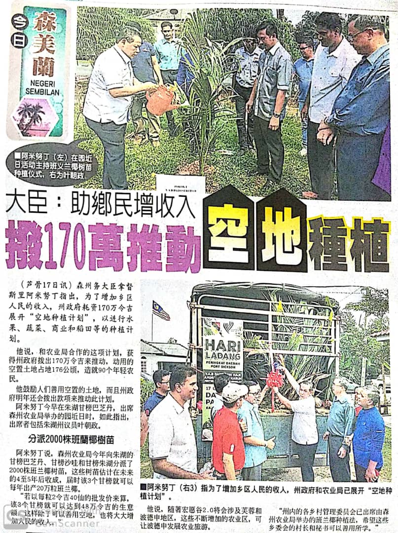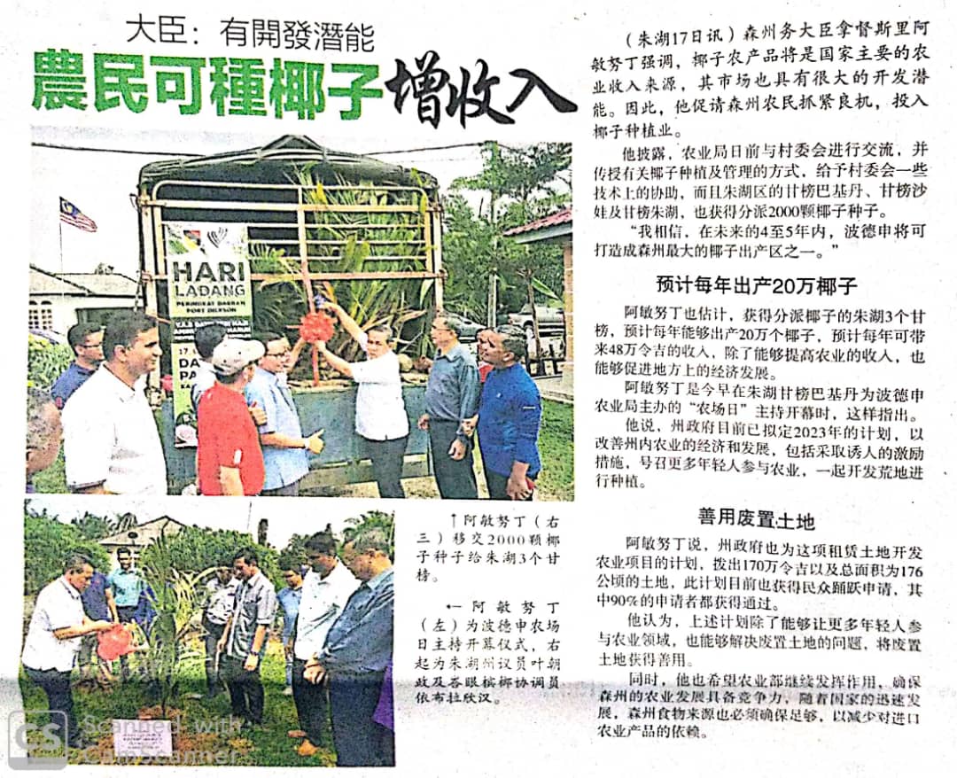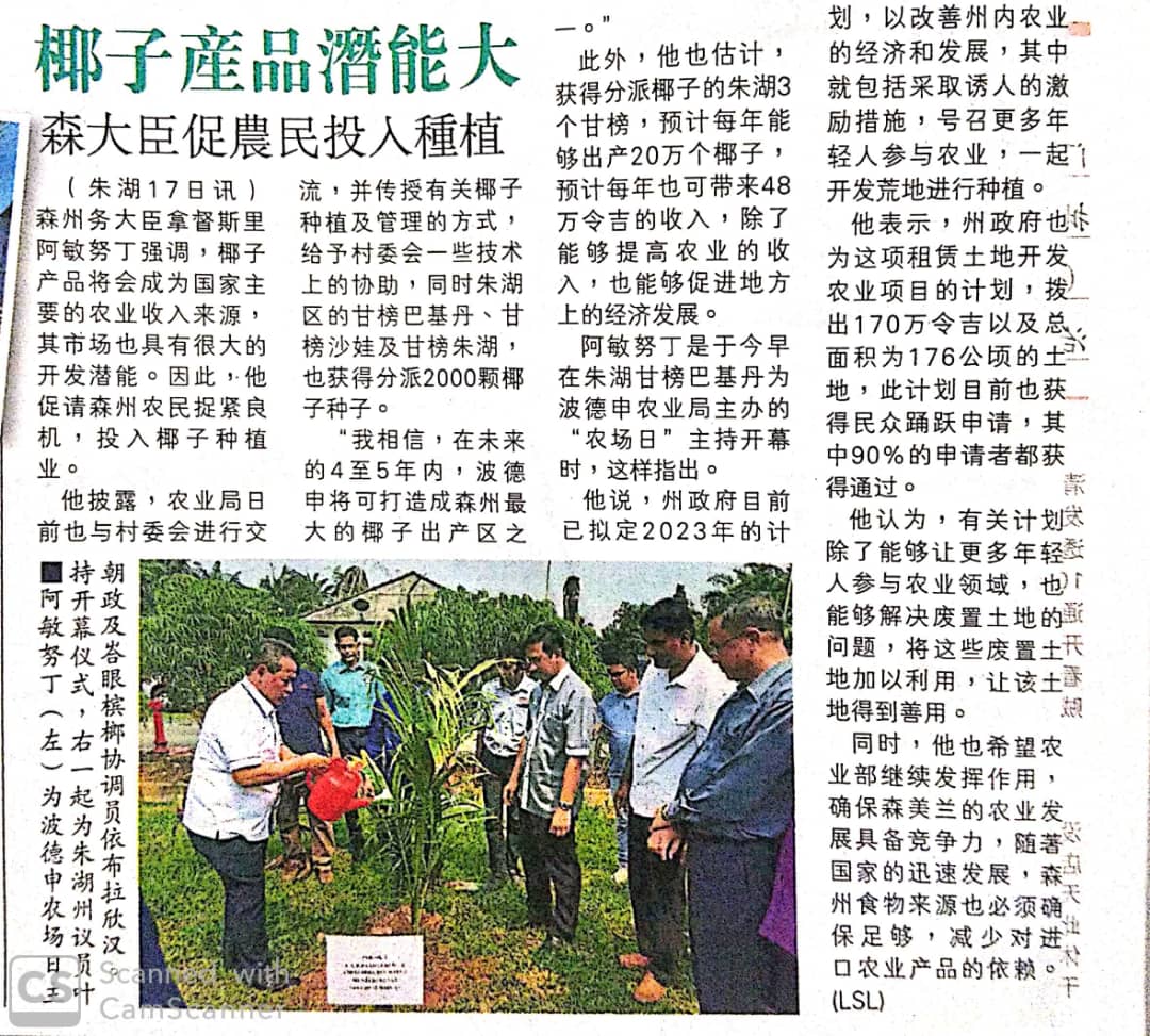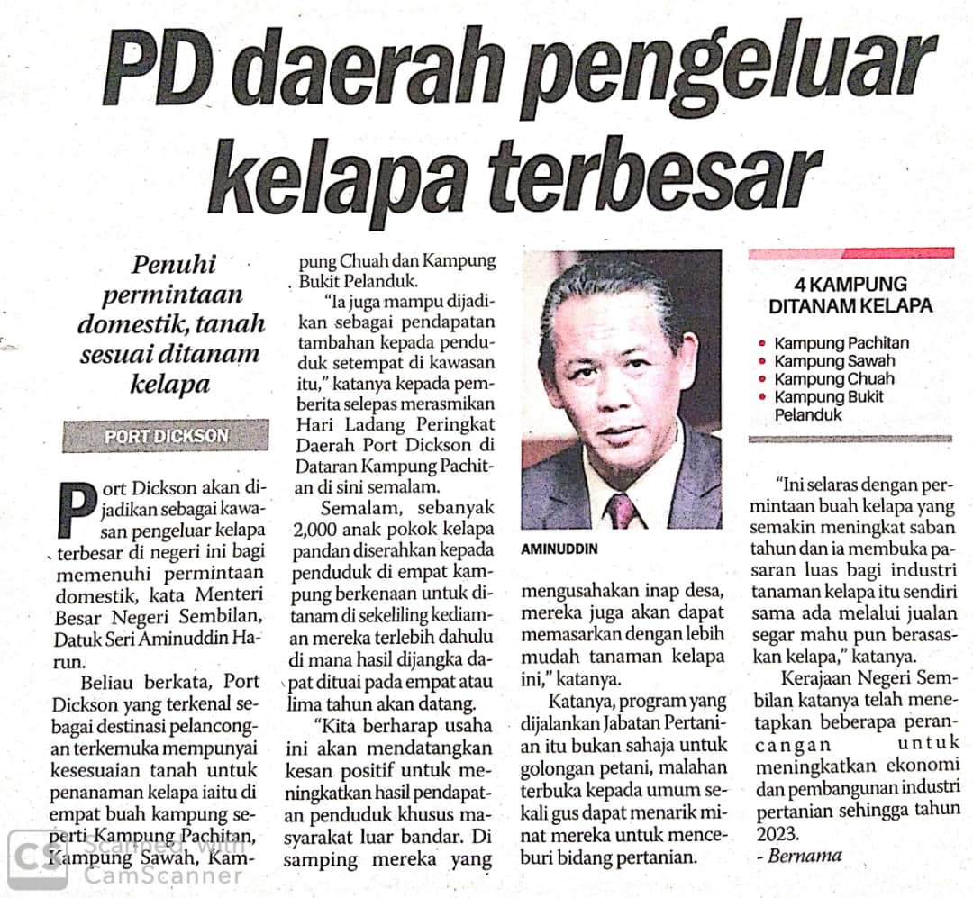 Tajuk :Menteri Besar: Kerajaan Negeri memberi peruntukan sebanyak RM170,000 untuk membantu penduduk setempatan menambah pendapatan dalam penananam pokok kelapa di daerah Port Dickson.