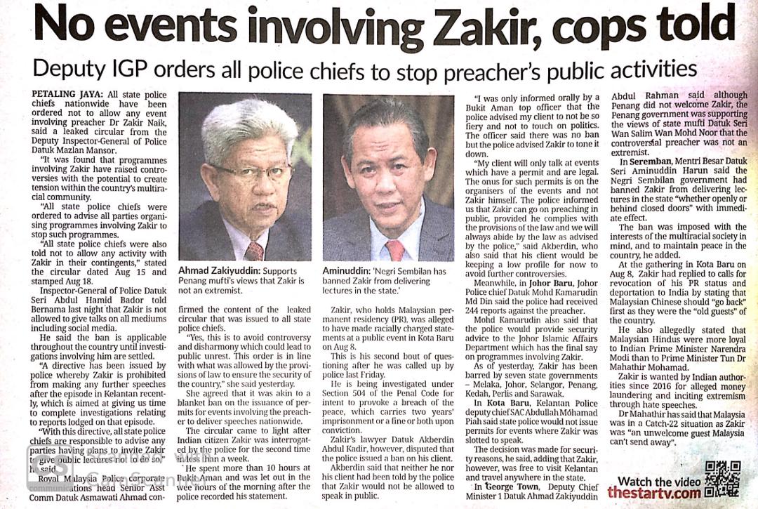 Tajuk :Seremban - MBNS melarang Dr Zakir Naik mengadakan ceramah di negeri ini bagi mengelakkan timbul sebarang isu perkauman demi menjaga perpaduan semua kaum.
