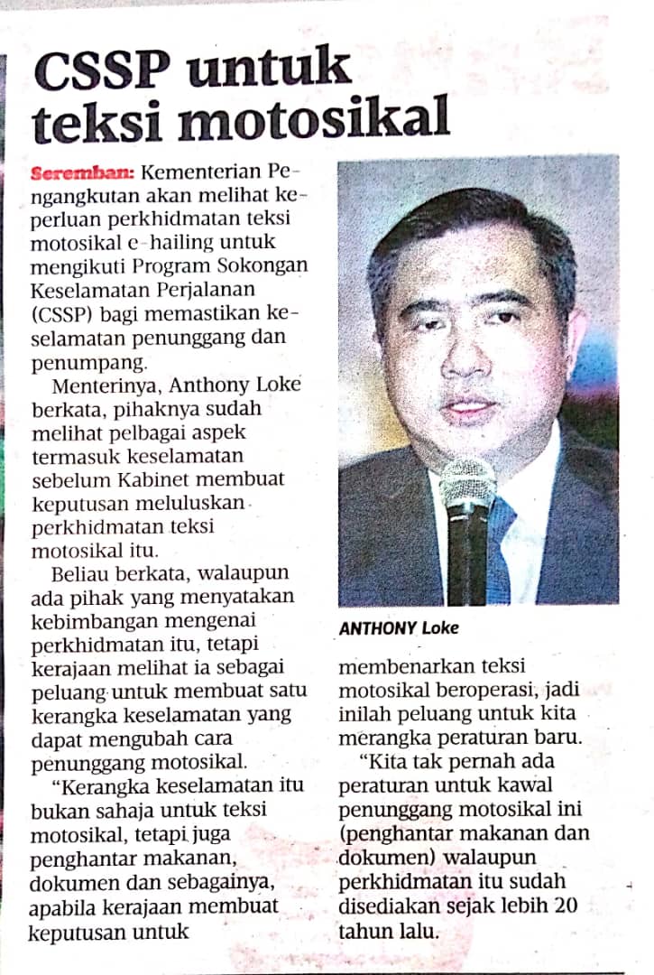 Tajuk :Loke Motocycle e-hailing laws to include goods
