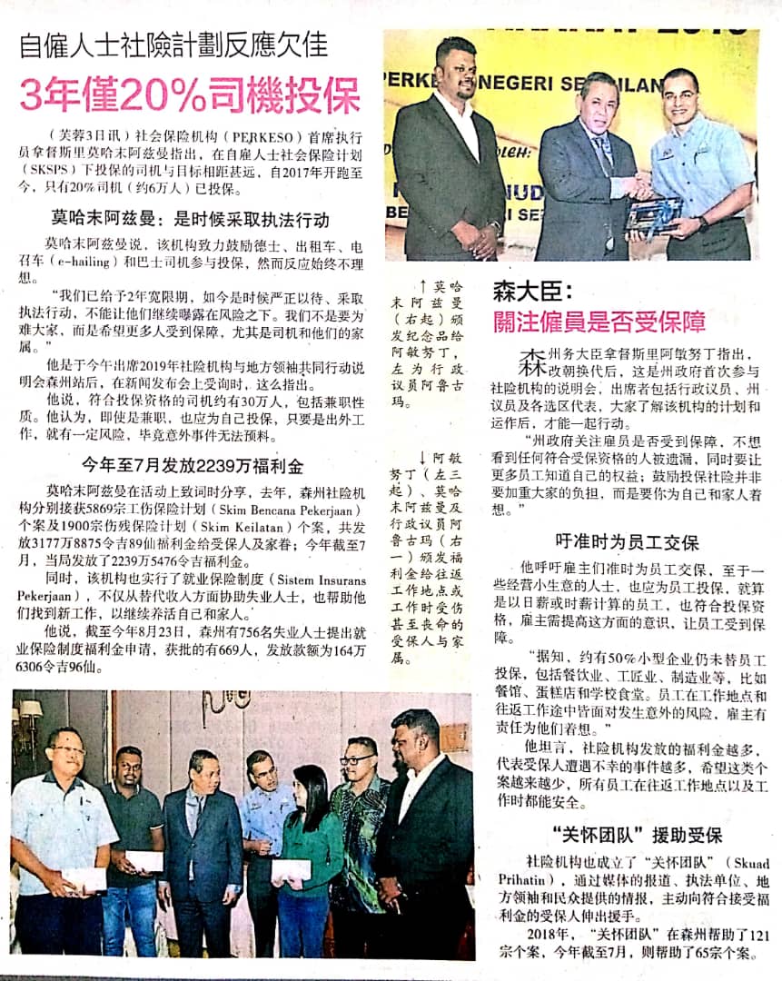 Tajuk :Seremban- Hanya 20% sahaja yang berdaftar dengan PERKESO melibatkan pemandu e-hailing, teksi dan bas. Skuad PERKESO Prihatin telah ditubuhkan bagi menangani setiap permasalahan yang berkaitan. MBNS berharap lebih ramai lagi tampil mendaftar dalam skim yang disediakan. Beliau bercakap dalam Majlis PERKESO Bersama Pemimpin Masyarakat Tahun 2019 di Klana Resort, Seremban semalam