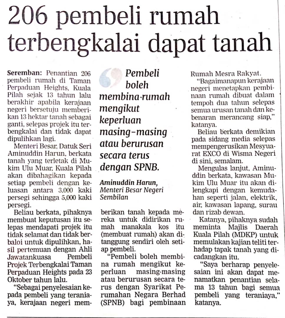Tajuk :206 pembeli rumah terbengkalai dapat tanah