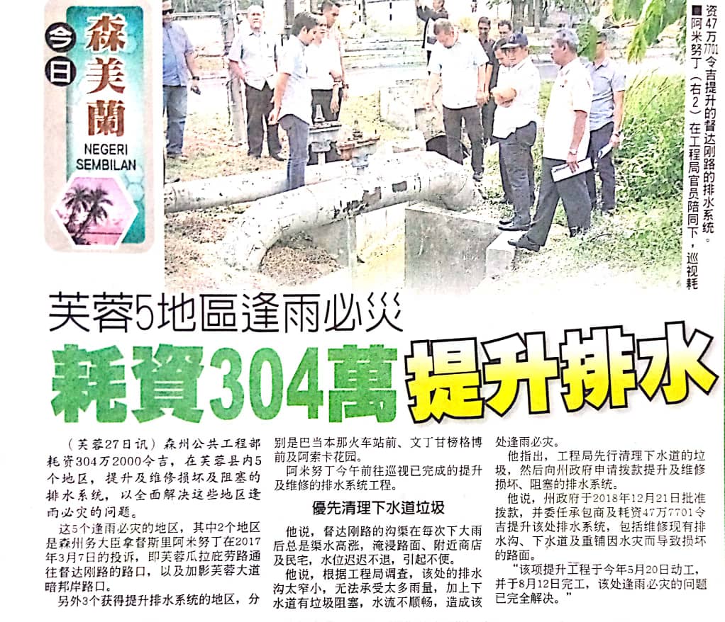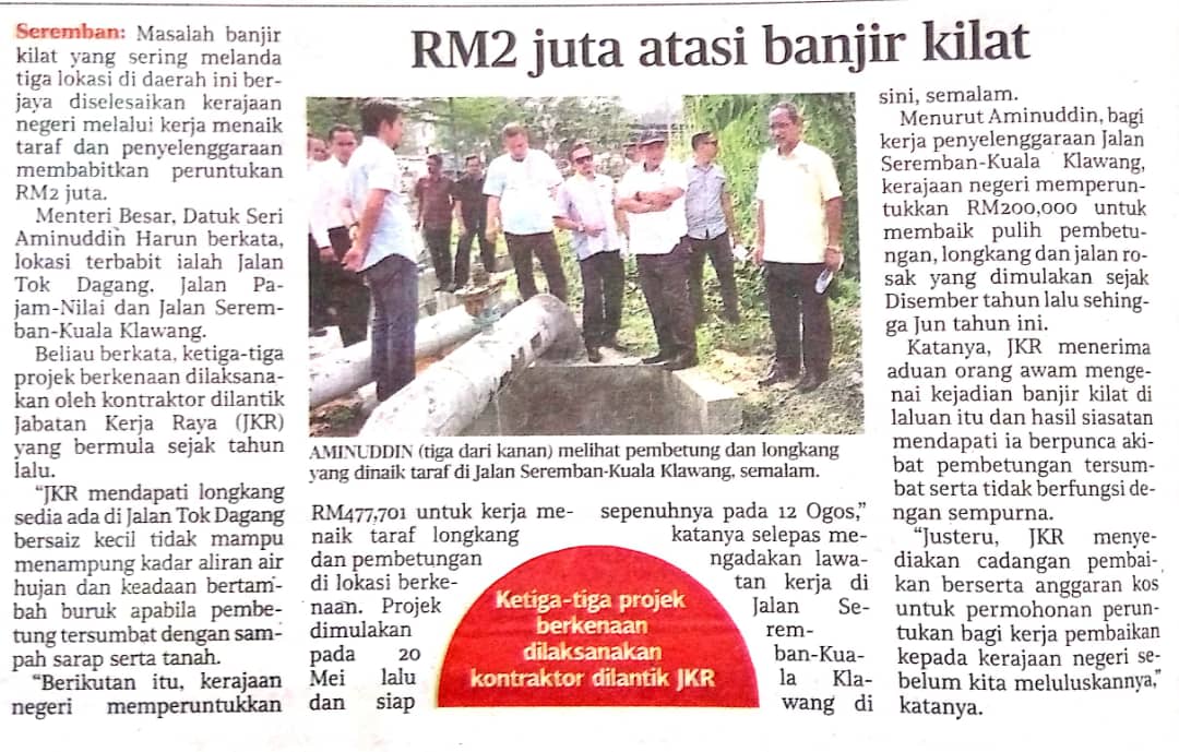Tajuk :Kerajaan negeri memperuntukkan RM477,701 untuk kerja menaik taraf longkang dan pembetungan di lokasi yang telah dikenal pasti bagi menangani masalah banjir kilat yang sering melanda kawasan tersebut