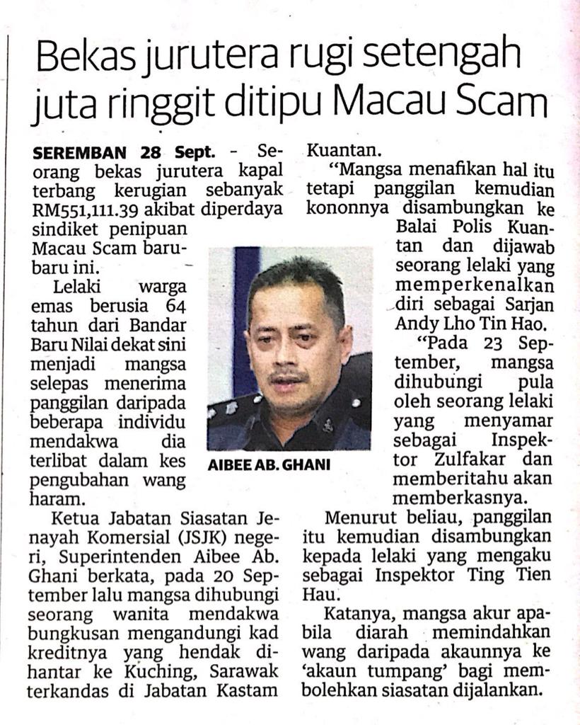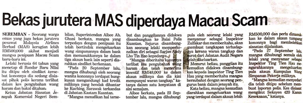 Tajuk :Bekas jurutera MAS diperdaya Macau Scam