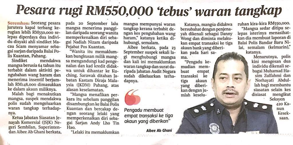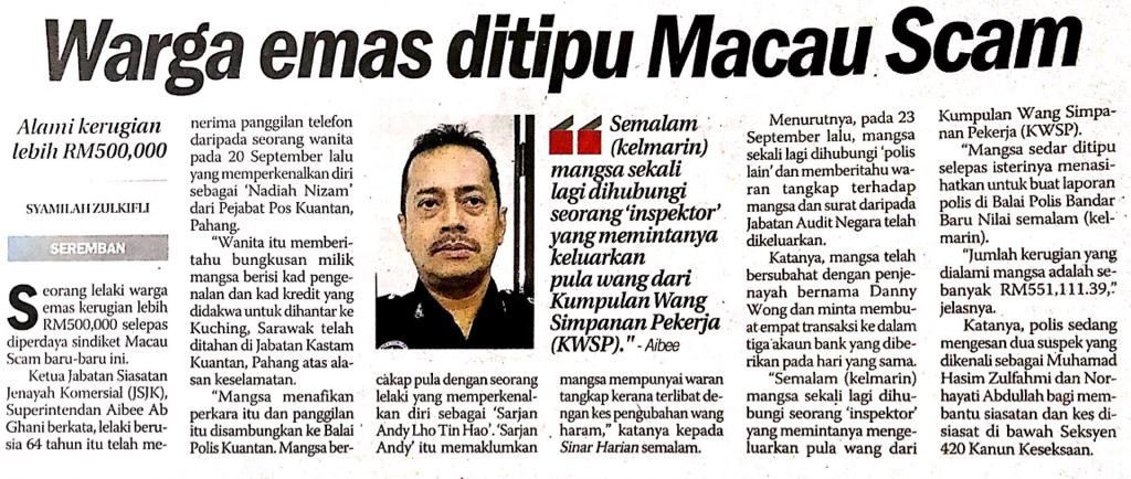 Tajuk :Pesara rugi RM500, 000 diperdaya Macau Scam