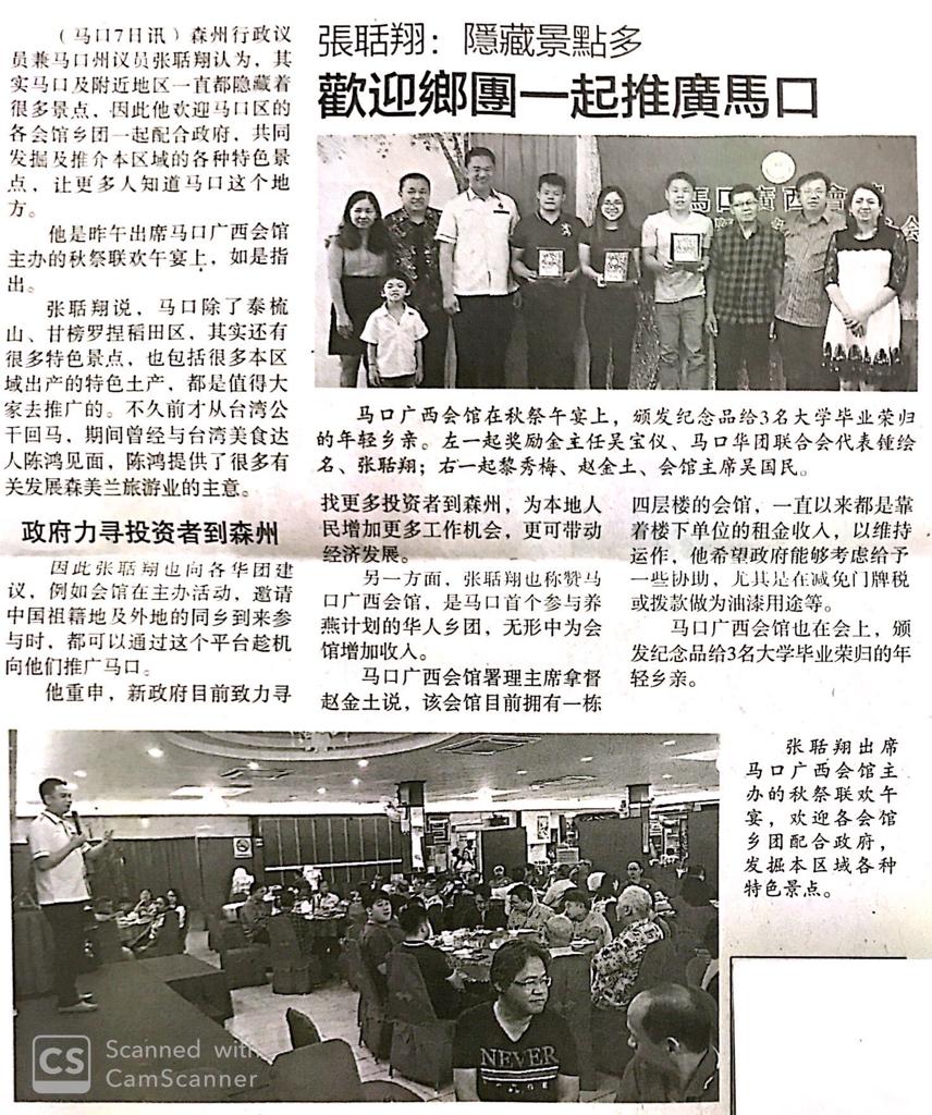 Tajuk :Bahau: YB Tuan Teo Kok Seong menghadiri majlis makan tengah hari musim luruh di Makou Guangxii Hall, cenderahati diberikan kepada tiga orang muda yang lulus dari universiti.