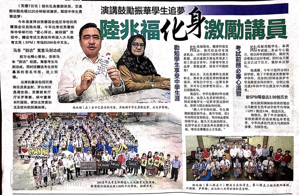 Tajuk :YB Tuan Anthony Loke Siew Fook membuat Kunjungan Kasih SPM 2019 di SMJK Chan Wa Seremban. Beliau sempat memberi kata-kata semangat kepada pelajar yang akan menghadapi peperiksaan SPM