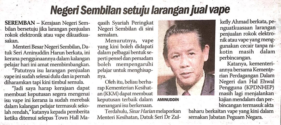 Tajuk :Negeri Sembilan setuju larangan jual vape