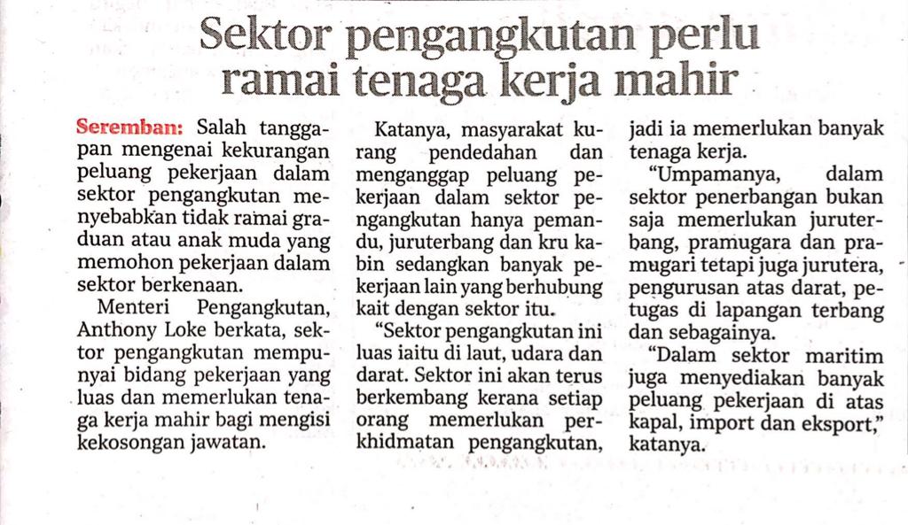 Tajuk :Sektor pengangkutan perlu ramai tenaga kerja mahir