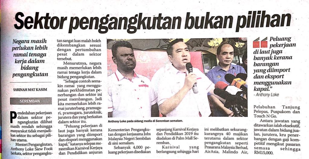 Tajuk :Seremban Pendedahan pekerjaan dalam sektor pengangkutan sangat rendah malah masyarakat tidak menjadikan sektor ini sebagai pilihan utama. YB Tuan Loke Siew Fook berkata sektor pengangkutan sebenarnya sektor
