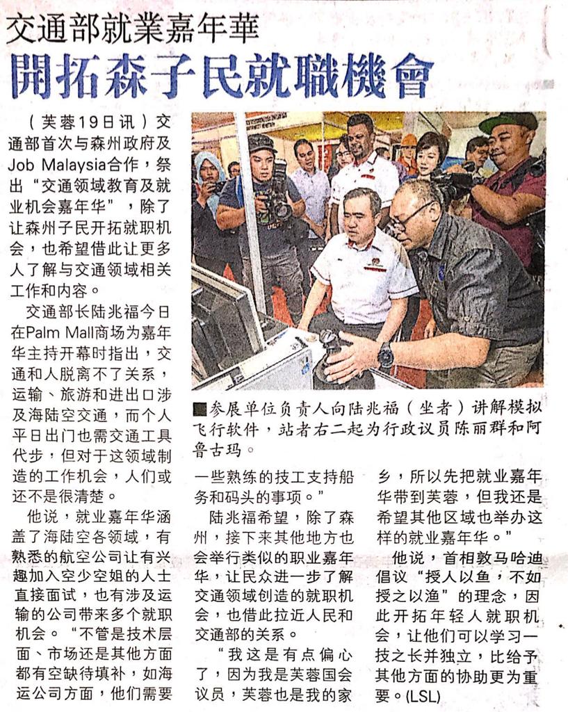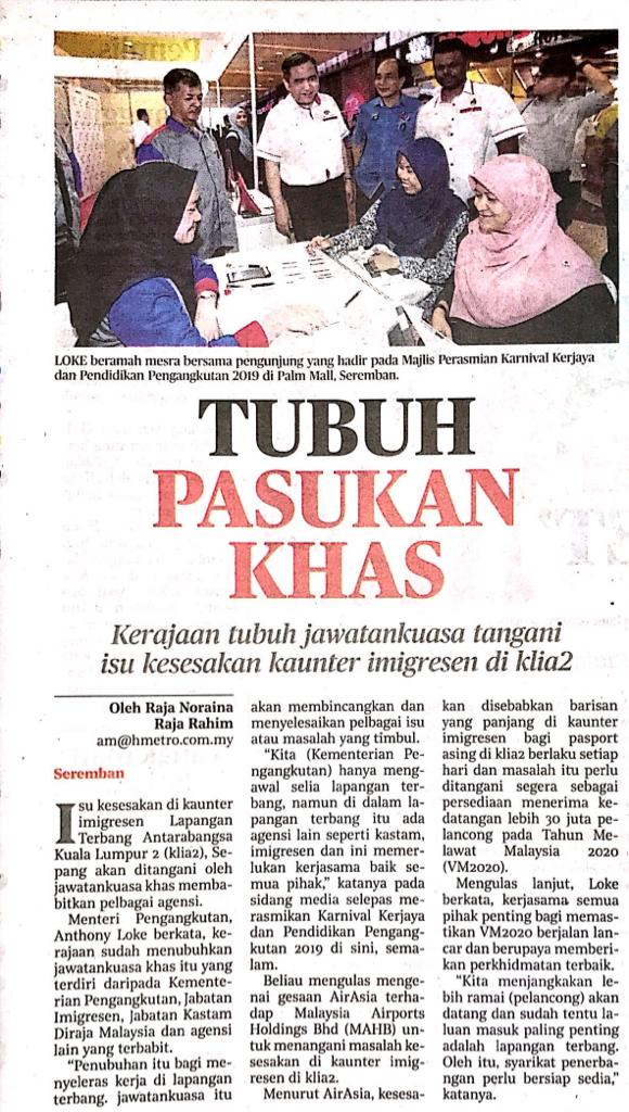 Tajuk :SerembanYB Tuan Loke Siew Fook telah merasmikan Karnival Kerjaya dan Pendidikan Sektor Pengangkutan 2019 di Palm Mall Seremban semalam. Beliau berkata dengan karnival ini masyarakat dapat melihat sektor pengangkutan
