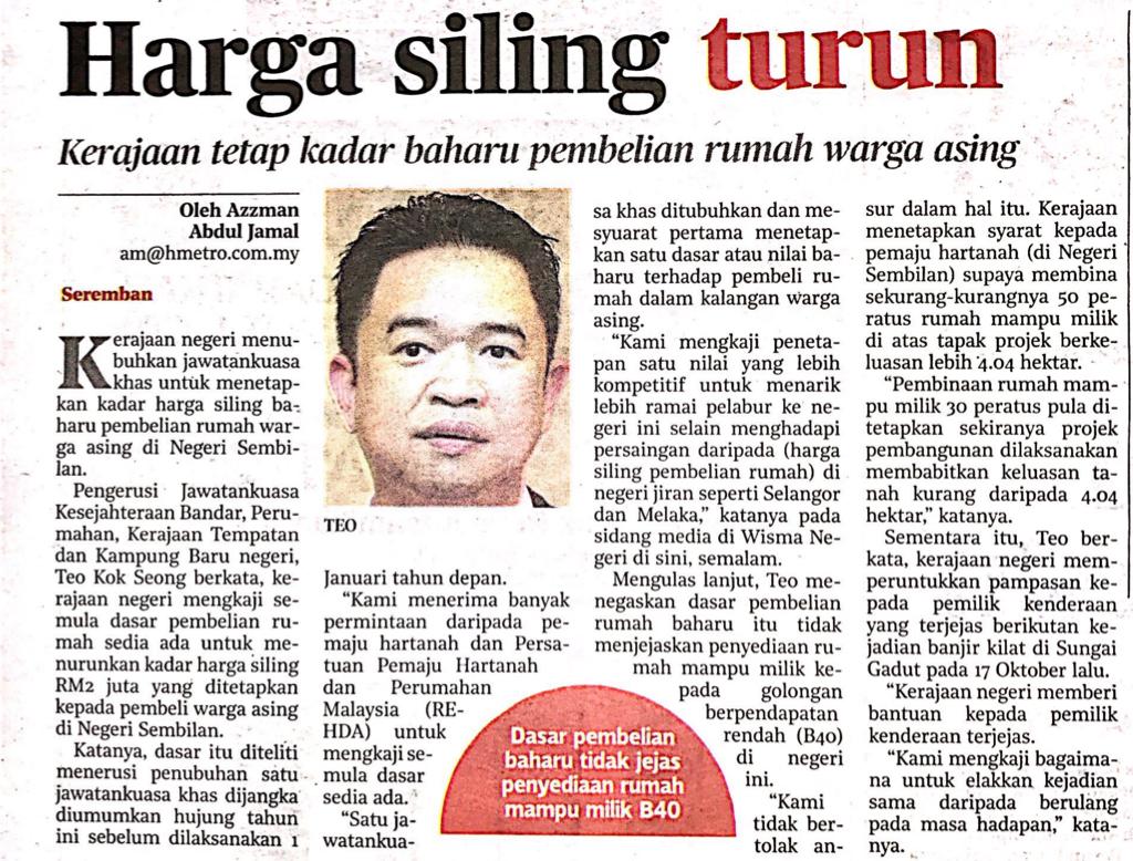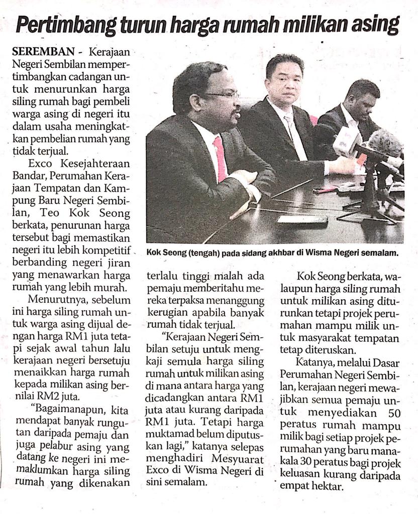 Tajuk :Seremban:YB Tuan Teo Kok Seong berkata kerajaan Negeri Sembilan akan melakukuan kajian semula bagi menurunkan harga siling rumah untuk pembeli warga asing bagi hartanah kediaman yang tidak terjual di negeri ini. Kajian ini dilakukan semula bagi memastikan harga siling rumah bagi pemilik warga asing lebih kompetitif.