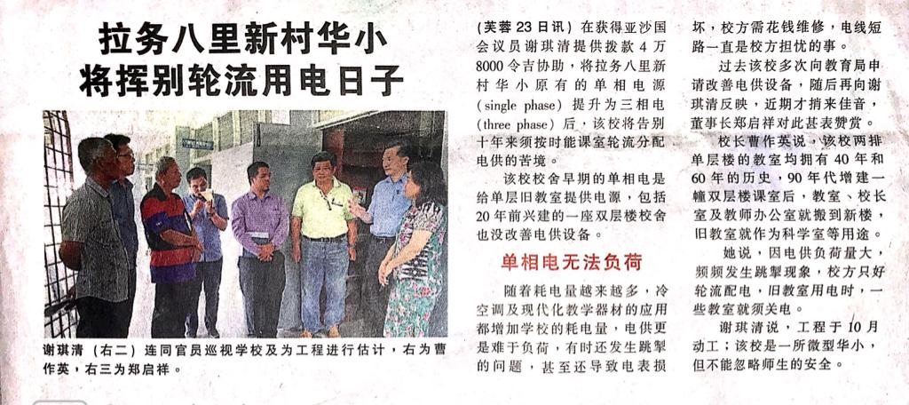 Tajuk :Labu:YB Tuan Cha Kee Chin melawat sebuah sekolah kebangsaan di Labu Batu 8,dimana sekolah tersebut mengalami masalah bekalan elektrik. Beliau berkata bantuan kepada sekolah ini akan diberikan bagi membaik pulih bekalan elektrik di sekolah ini dan projek perbaiki bekalan elektrik ini akan bermula pada bulan Oktober ini.