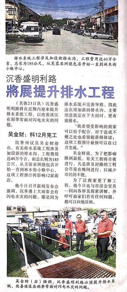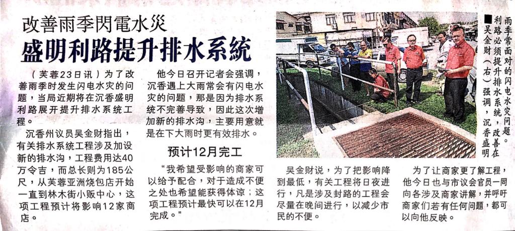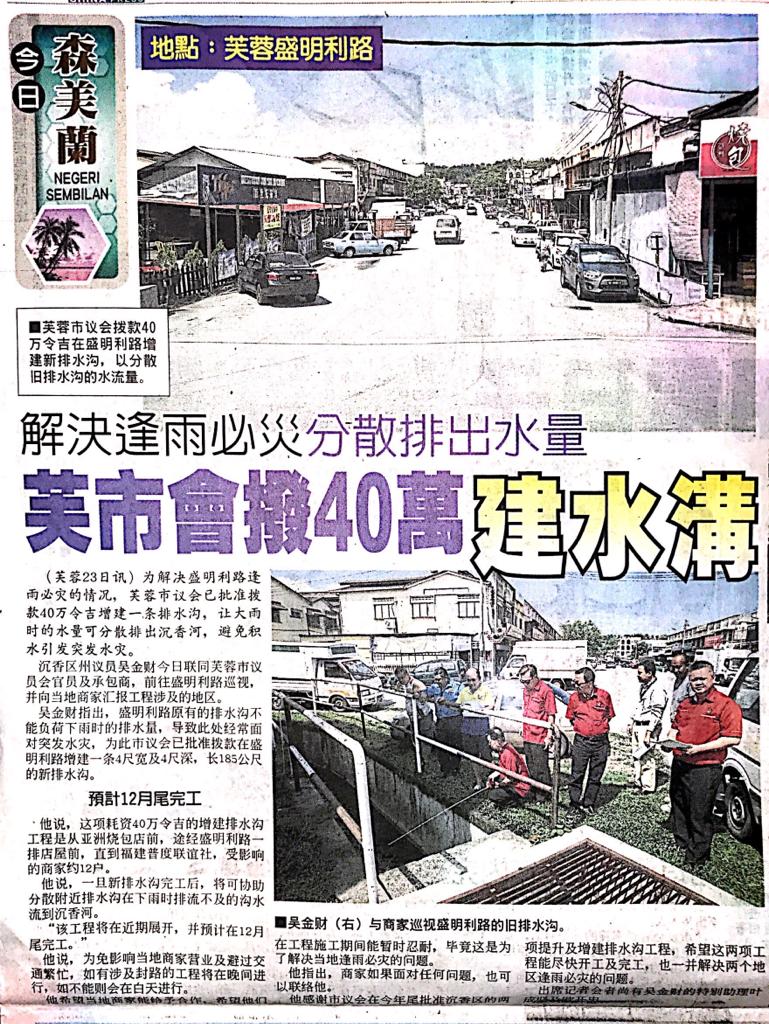Tajuk :Seremban: YB Tuan Ng Chin Tsai memberitahu bahawa projek menaik taraf sistem saliran parit dijangka siap pada Disember ini. Beliau menegaskan projek ini mesti dilakukan supaya dapat menangani isu banjir dikawasan ini.