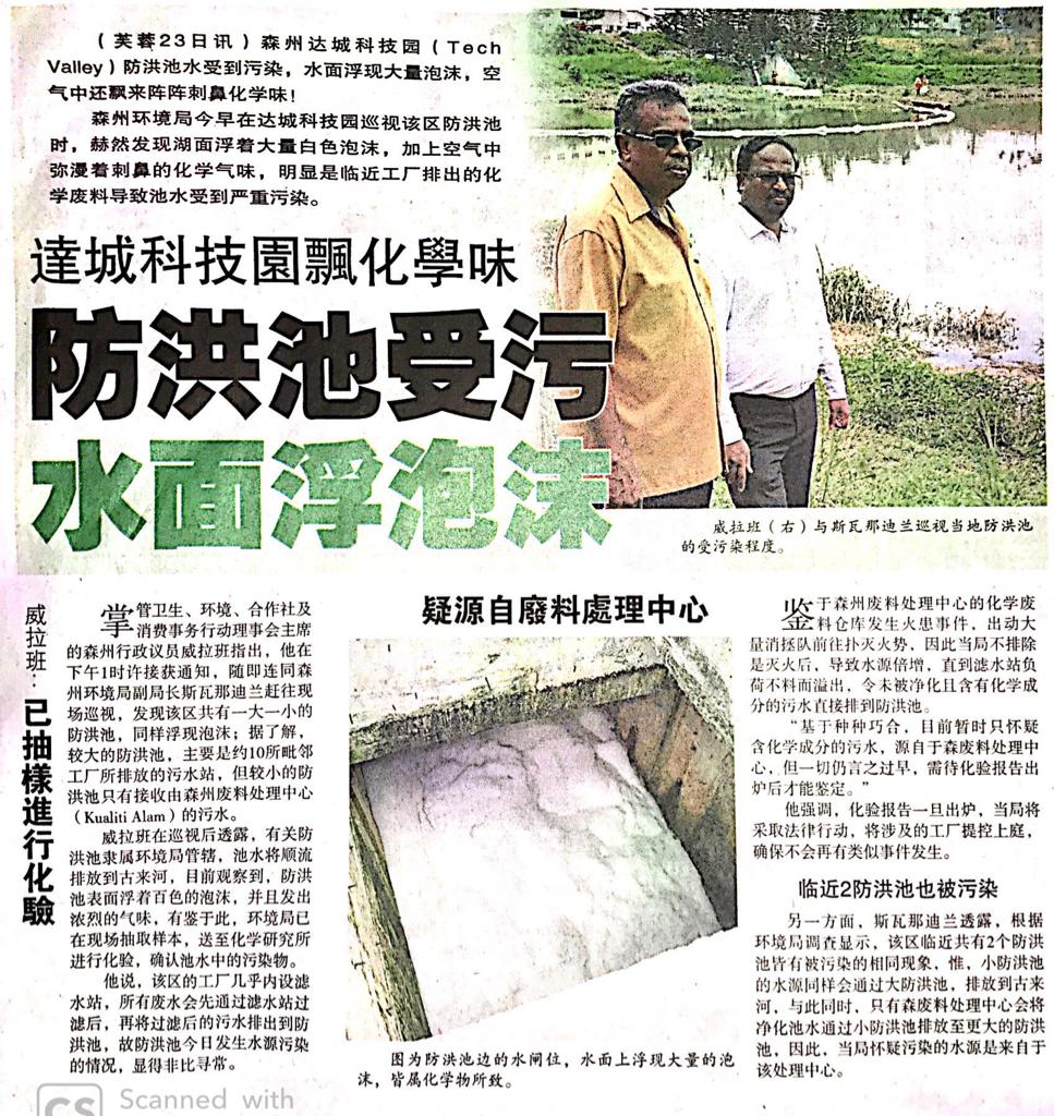 Tajuk :Seremban: YB Tuan Veerapan melawat kawasan air yang tercemar di kawasan Sendayan Tech Valley. Beliau berkata beberapa sampel air telah diambil untuk dianalisis.