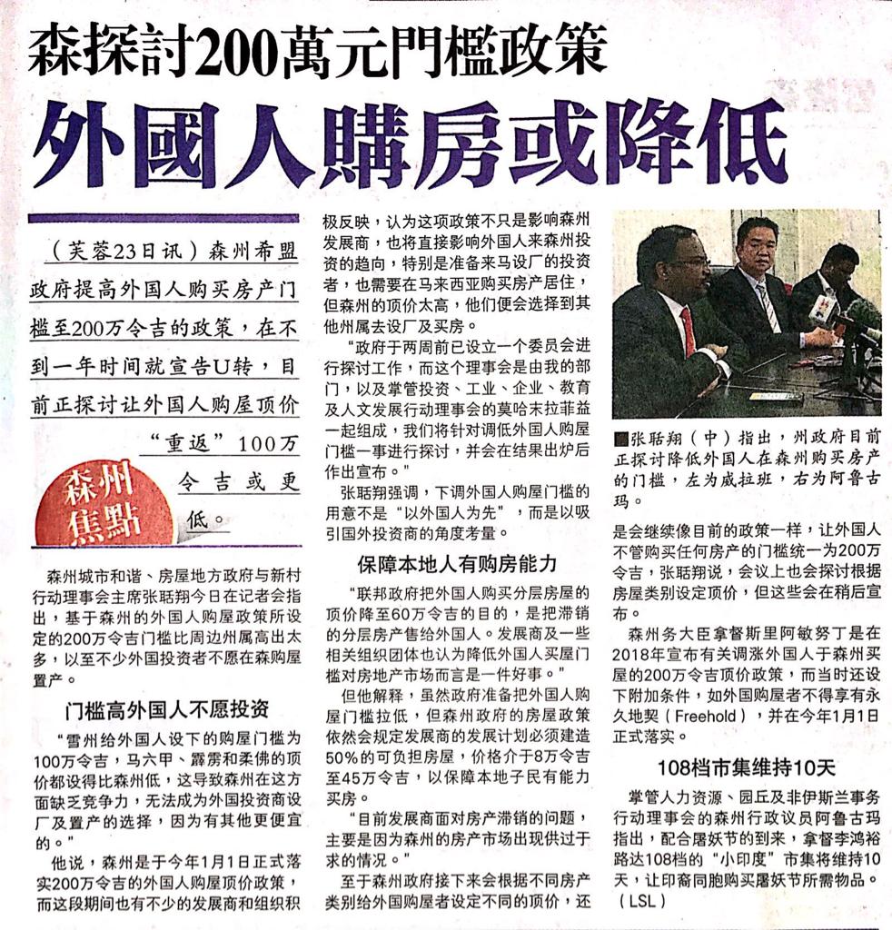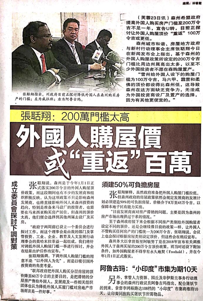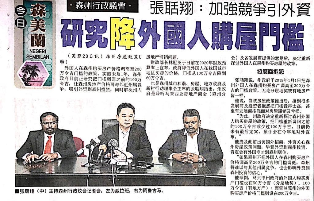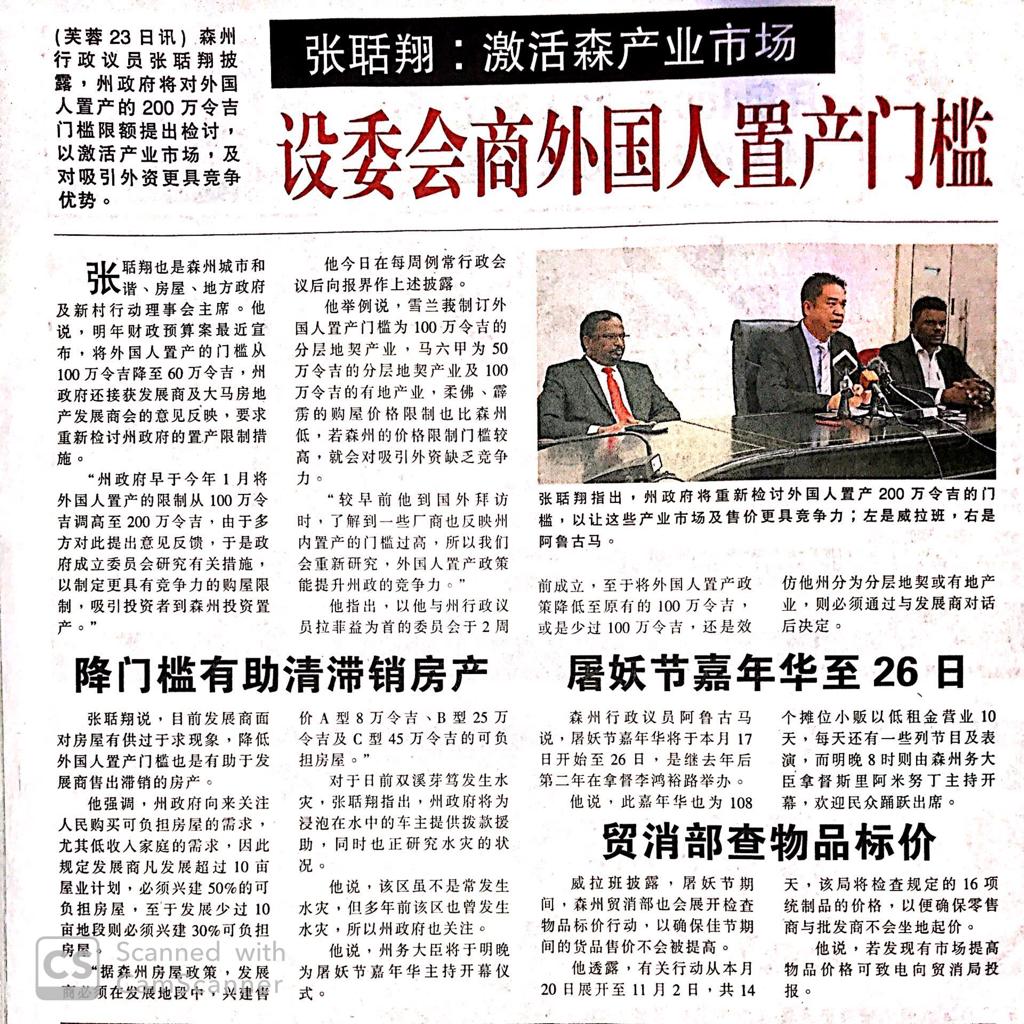Tajuk :Seremban:YB Tuan Teo Kok Seong berkata kerajaan Negeri Sembilan akan mempertimbangkan cadangan penurunan harga siling rumah bagi pembeli warga asing di negeri itu dalam usaha meningkatkan pembelian rumah yang tidak terjual. YB Tuan Arul Kumar pula mengulas mengenai Karnival Deepavali yang akan diadakan di Seremban yang telah berlansung pada 17 sehingga 26 Oktober 2019.