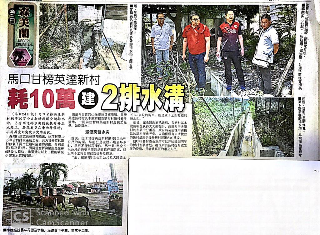 Tajuk :Bahau: Kampung Indah,Bahau diperuntukan sebanyak RM100 000 untuk membina 2 parit saliran baru. Projek membina parit saliran baru ini adalah bertujuan untuk mengelak masalah banjir yang dihadapi oleh penduduk Kampung Indah ini.YB Tuan Teo Kok Seong meninjau kawasan Kampung Indah Bahau untuk melihat sistem saliran parit di Kampun Indah.