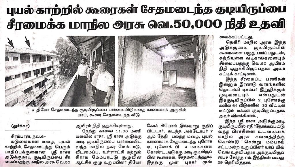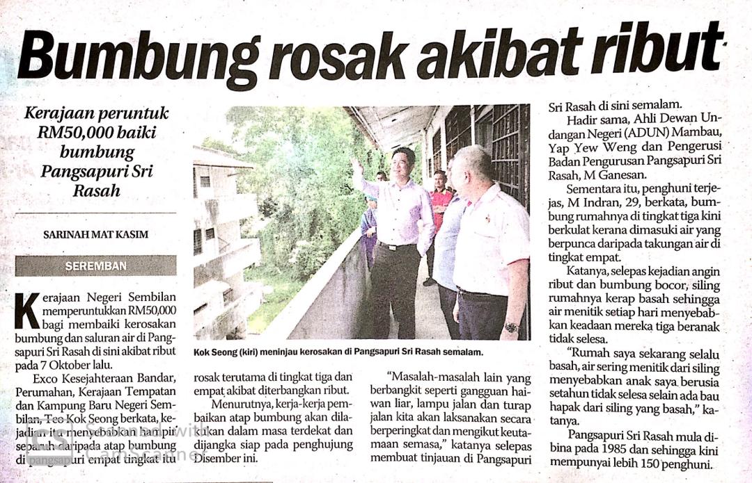 Tajuk :Kerajaan Negeri memperuntukan bantuan bagi membaiki beberapa kerosakan yang terdapat di Pangsapuri Sri Rasah akibay ribut pada 7 Oktober lepas. YB Tuan Teo Kok Seong berkata kejadian itu menyebabkan penduduk pangsapuri tersebut tidak dapat menjalankan kehidupan harian dengan selesa semasa beliau meninjau kawasan pangsapuri ini.Turut hadir bersama YB Tuan Yap Yew Weng,ADUN Mambau