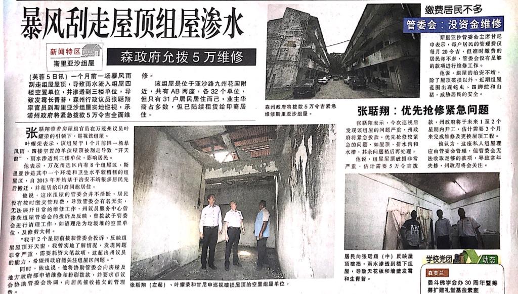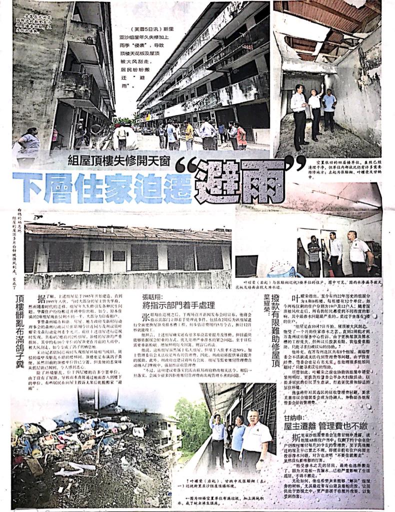 Tajuk :YB Tuan Teo Kok Seong bersama YB Tuan Yap Yew Weng telah melawat Flat Sri Rasah. YB Teo Kok Seong memberitahu bumbung rumah flat tercabut dan rosak,beliau menyeru JMB membuat tindakan segera