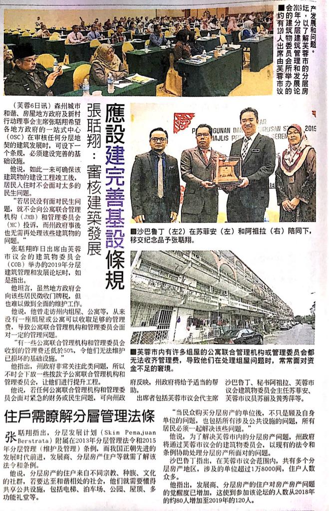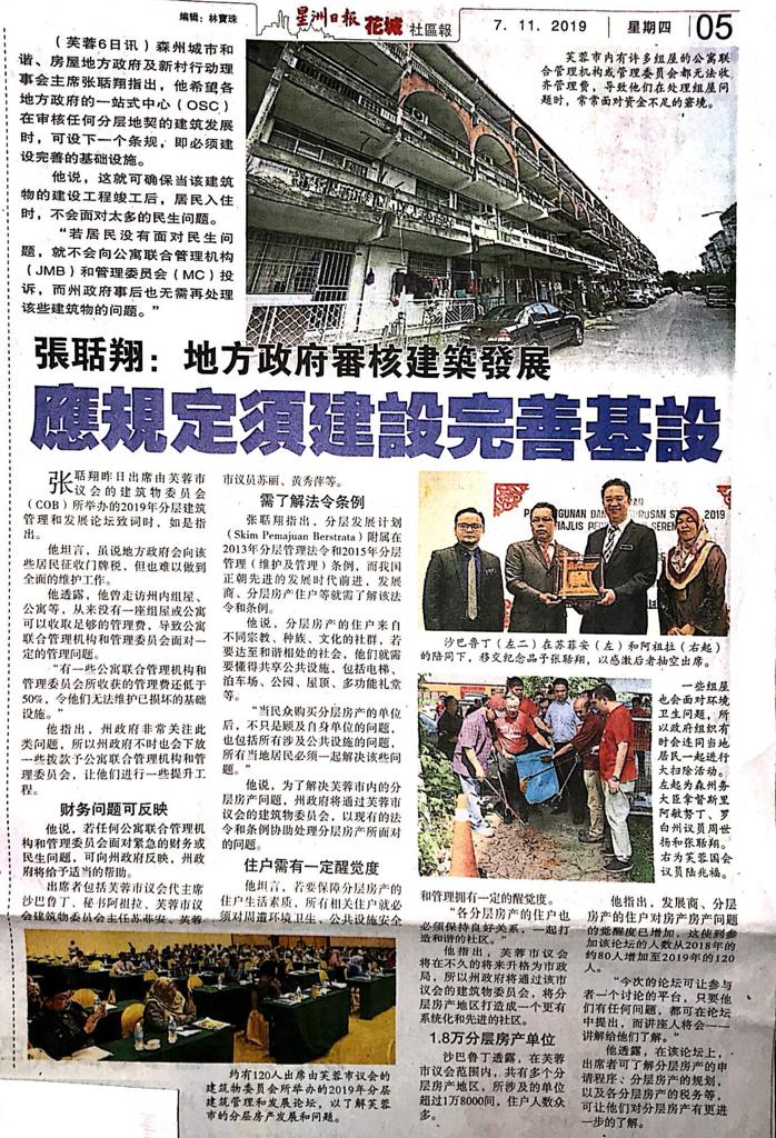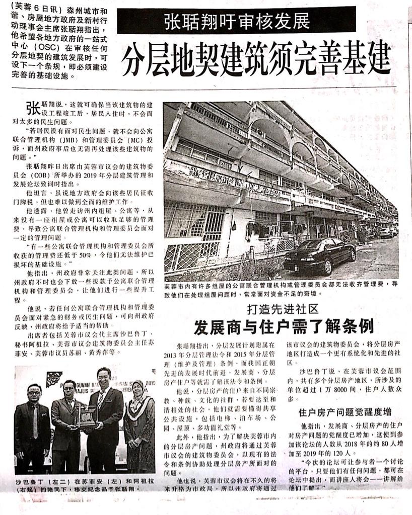 Tajuk :Seremban: Kekurangan dana dan yuran pengurusan telah menyebabkan kerja-kerja pengurusan rumah flat,pangsapuri dan kondominium oleh Management Corporation(MC),Badan Pengurusan Bersama atau Joint Management Body(JMB) terganggu,kata YB Tuan Teo Kok Seong semasa beliau merasmikan Seminar Pembangunan dan Pengurusan Strata 2019 di Klana Resort ,Seremban.