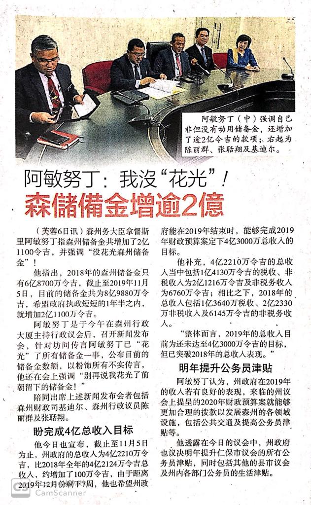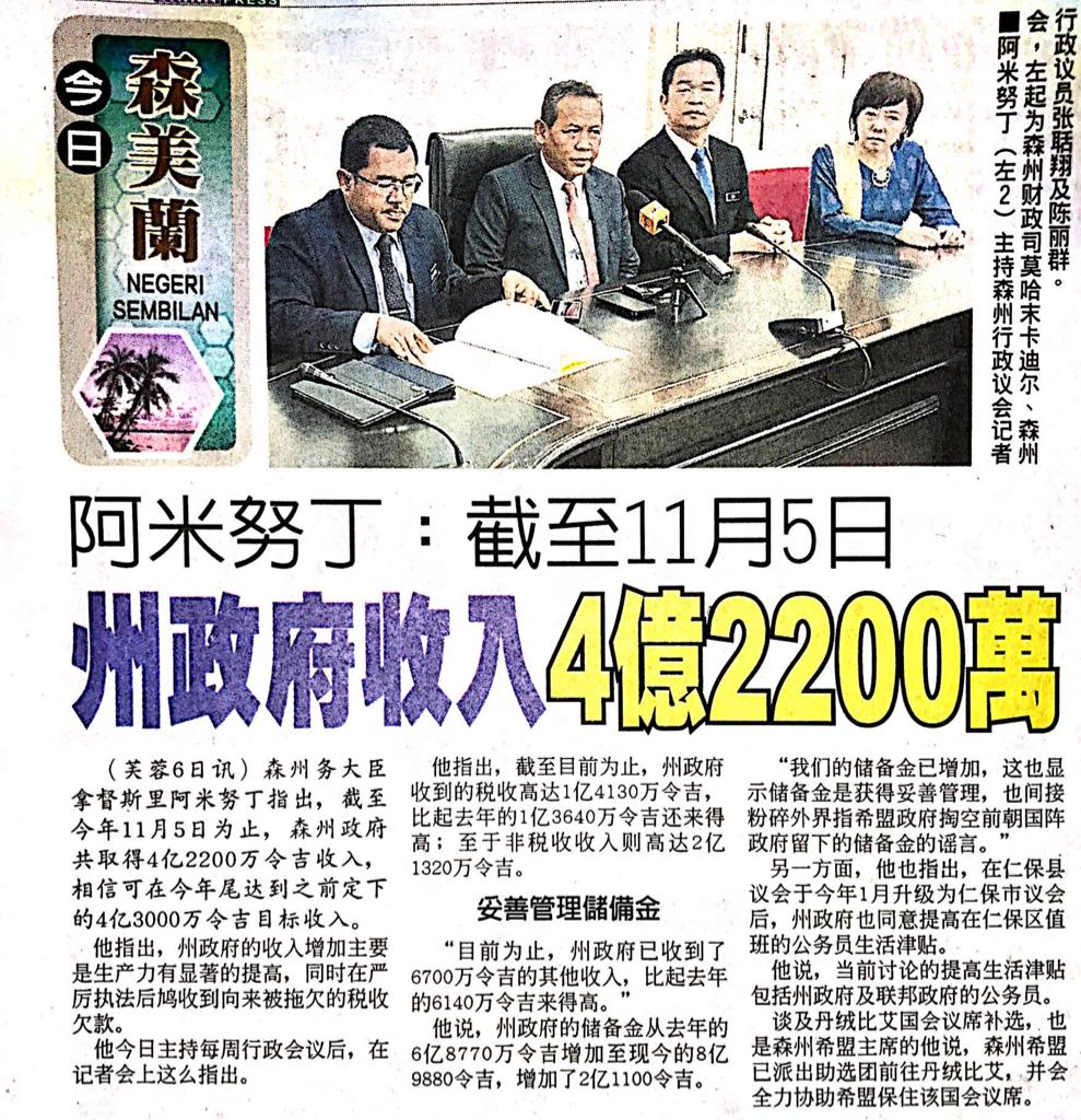 Tajuk :Seremban: MBNS berkata hasil kerajaan Negeri Sembilan telah mencatatkan peningkatan kepada RM422 juta sehingga tempoh 5 November lalu berbanding RM421 juta pada tahun 2018. Beliau juga berkata antara faktor peningkatan hasil kerajaan Negeri Sembilan adalah kerana peningkatan produktiviti yang memberangsangkan selain ketegasan dalam penguatkuasaan yang berjaya mengutip hasil cukai yang tertunggak sebelum ini.