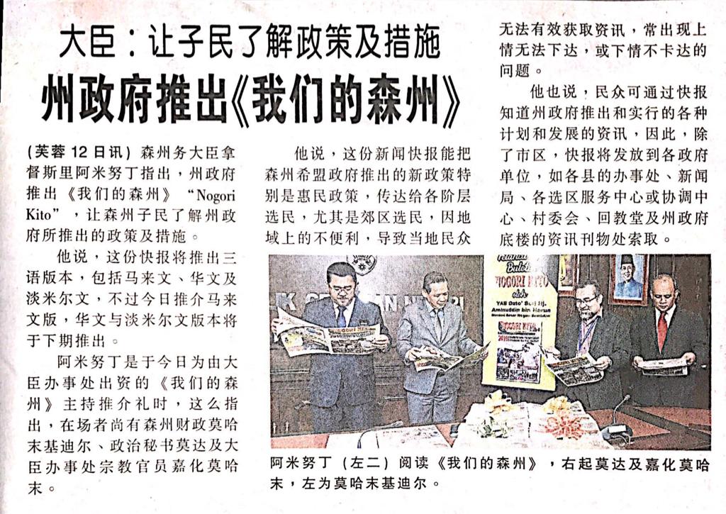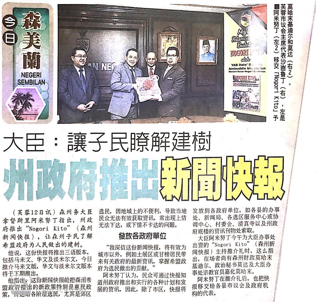 Tajuk :Seremban: Majlis Pelancaran Buletin “Nogori Kito” oleh MBNS.MBNS menegaskan pelancaran Buletin “Nogori Kito” adalah untuk menyampaikan maklumat berkaitan inisiatif dan insentif yang dilaksanakan Kerajaan Negeri sepanjang tahun yang berlandaskan Belanjawan 2019 yang lalu.