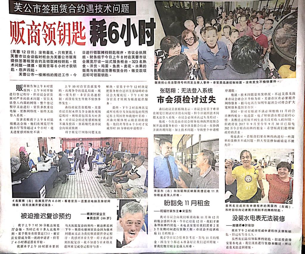 Tajuk :Seremban:Proses menandatangani perjanjian antara Majlis Perbandaran Seremban(MPS) dan penjaja pasar Seremban mengalami masalah teknik sehingga menyebabkan para penjaja terpaksa menunggu dalam jangka masa yang lama. Menurut YB Tuan Teo Kok Seong pegawai MPS telah menjalankn percubaan masuk ke server MPS sebelum hari kejadian dan ia tiada sebarang masalah,malangnya pada hari semalam server MPS menghadapai gangguan.Beliau juga berkata pada tahun akan datang,MPS akan cuba memperbaiki proses pendaftaran pada masa akan datang.