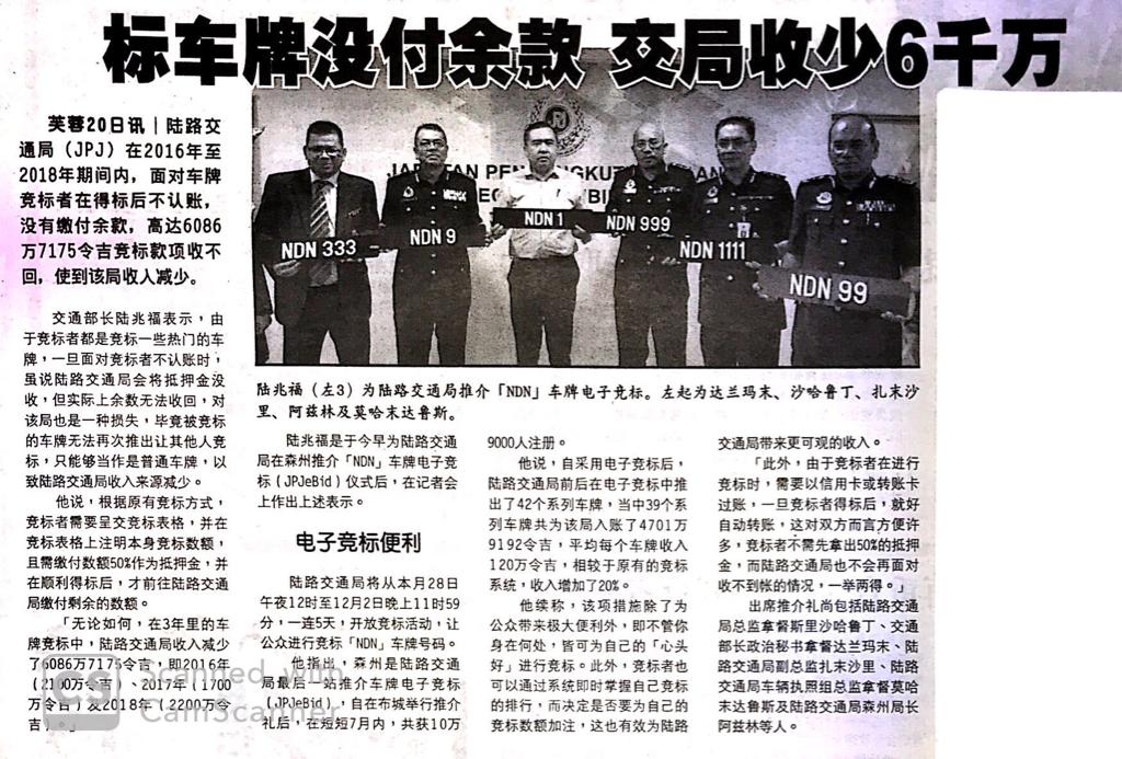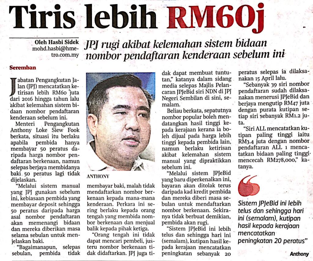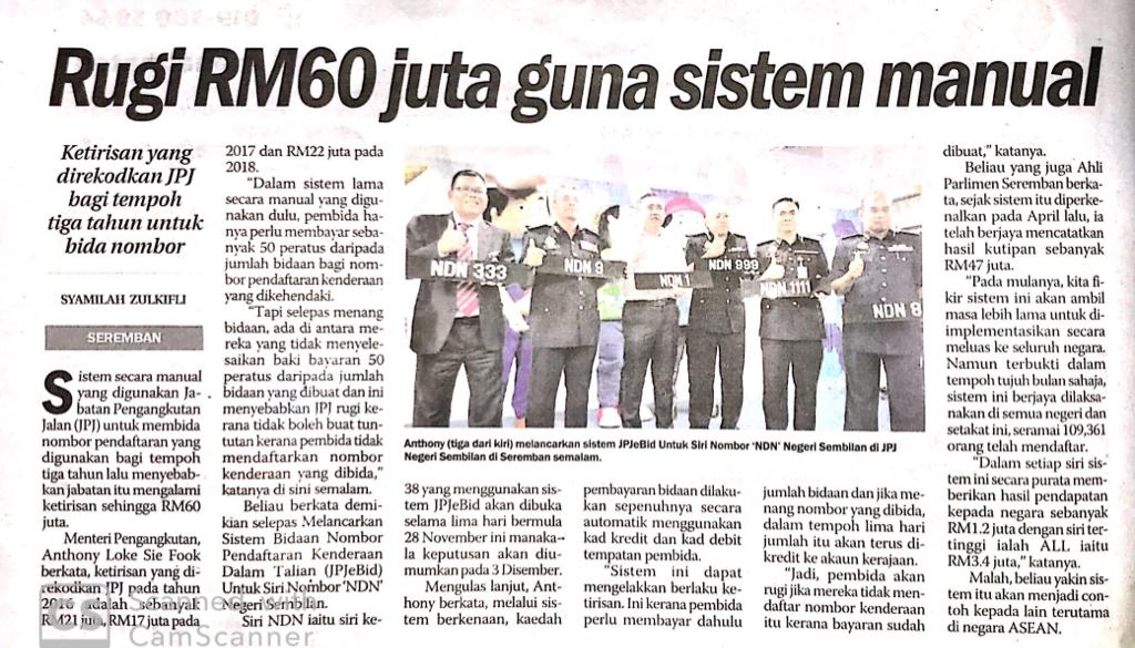 Tajuk :Seremban:YB Tuan Loke Siew Fook telah hadir merasmikan Majlis Pelancaran Bidaaan No Pendaftaran Kenderaan salam Talian(JPJeBid)siri NDN di JPJ Negeri Sembilan.