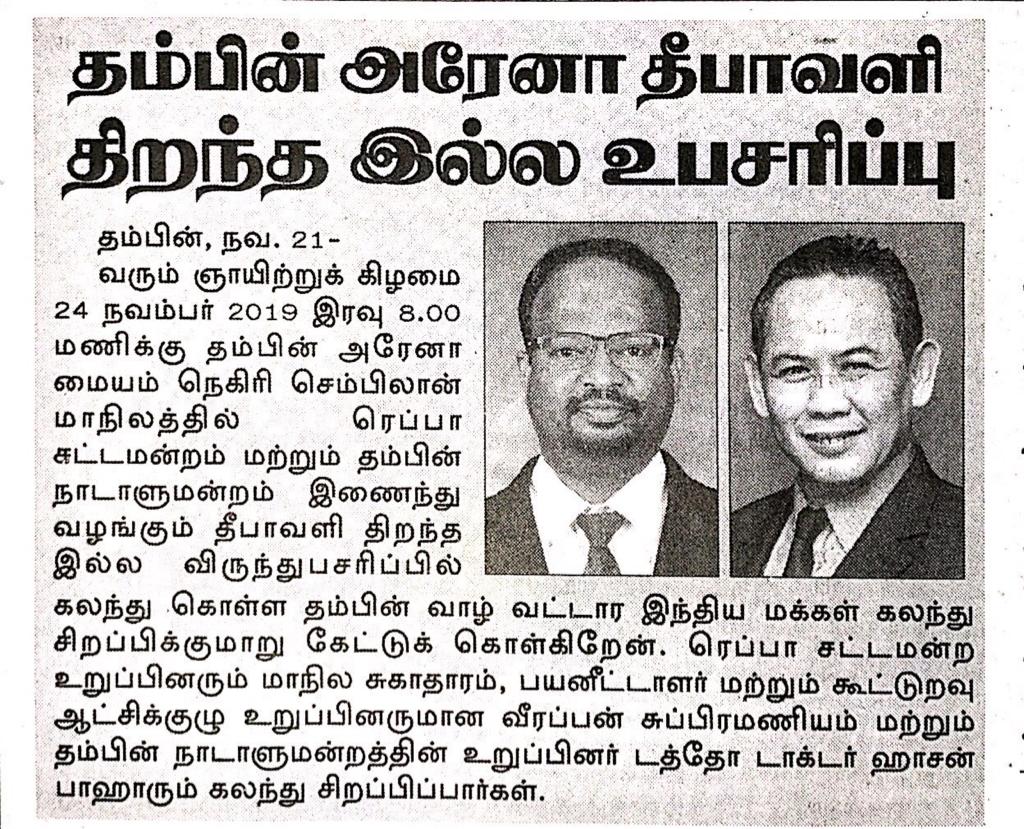 Tajuk :Tampin:YB Tuan Veerapan menjemput orang ramai untuk menghadiri Rumah Terbuka Sambutan Perayaan Deepavali Daerah Tampin pada 24 November 2019.