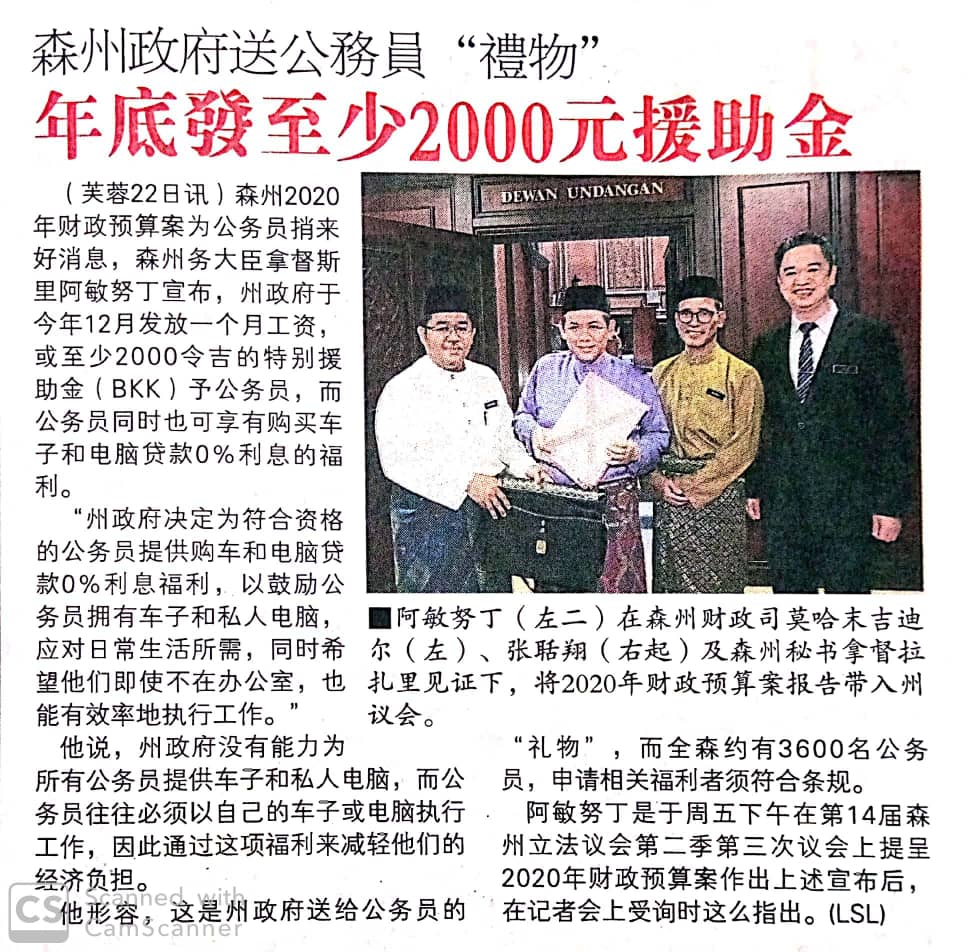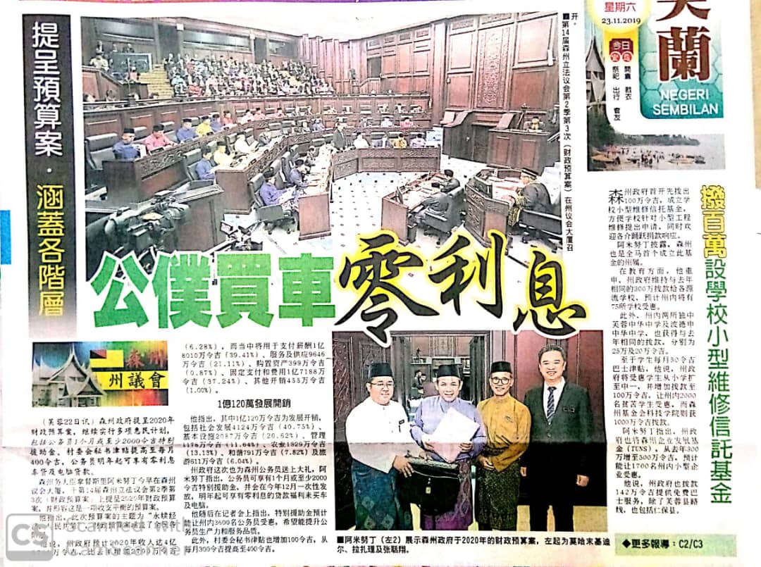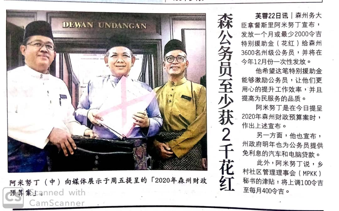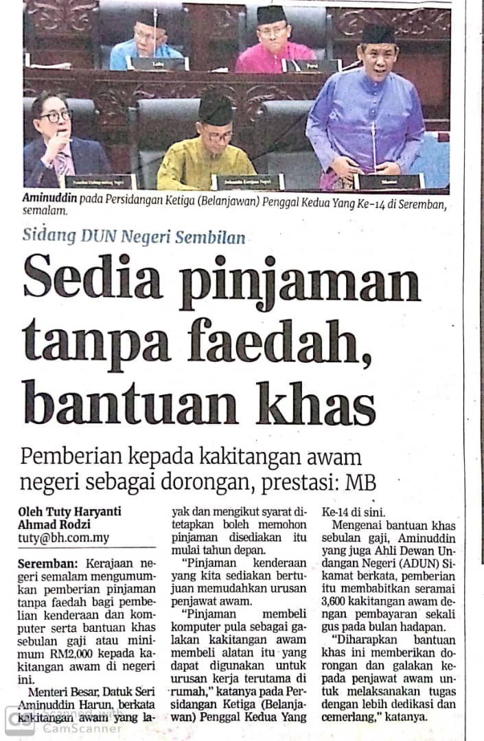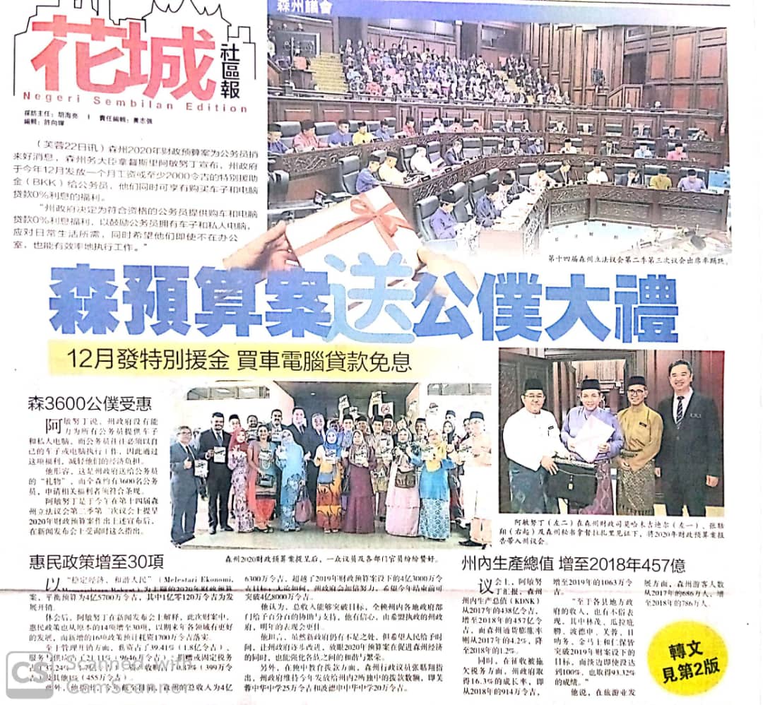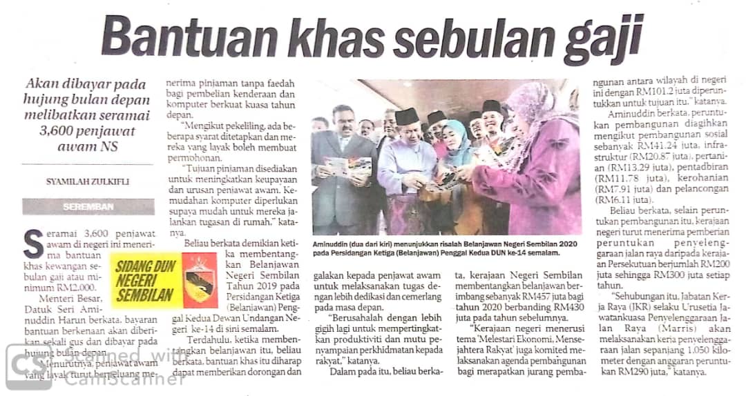 Tajuk :Seremban- Pembentangan Belanjawan Negeri Sembilan 2019 pada Persidangan Ketiga Penggal Kedua Dewan Undangan Negeri ke-14 semalam berimbang sebanyak RM457 juta bagi tahun 2020 berbanding RM430 juta pada tahun sebelumnya. Kerajaan negeri komited melaksanakan agenda pembangunan antara wilayah di negeri ini dengan peruntukkan yang ditetapkan. Disamping itu beliau turut mengumumkan pemberian Bantuan khas Kewangan sebulan gaji atau minimum RM2,000 kepada 3,600 penjawat awam di negeri ini.