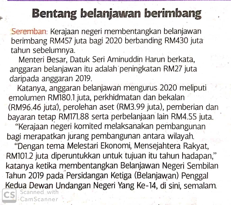 Tajuk :Seremban- Kerajaan negeri membentangkan belanjawan berimbang RM457 juta bagi 2020 berbanding RM430 juta tahun sebelumnya. Menurut MBNS kerajaan komited melaksanakan pembangunan bagi merapatkan jurang antara wilayah. Beberapa berita gembira telah disampaikan terutama bagi penjawat awam di negeri ini. Beliau berharap dengan pengumuman ini akan mendorong dan memberi semangat kepada penjawat awam agar lebih berdedikasi dalam menjalankan tugas